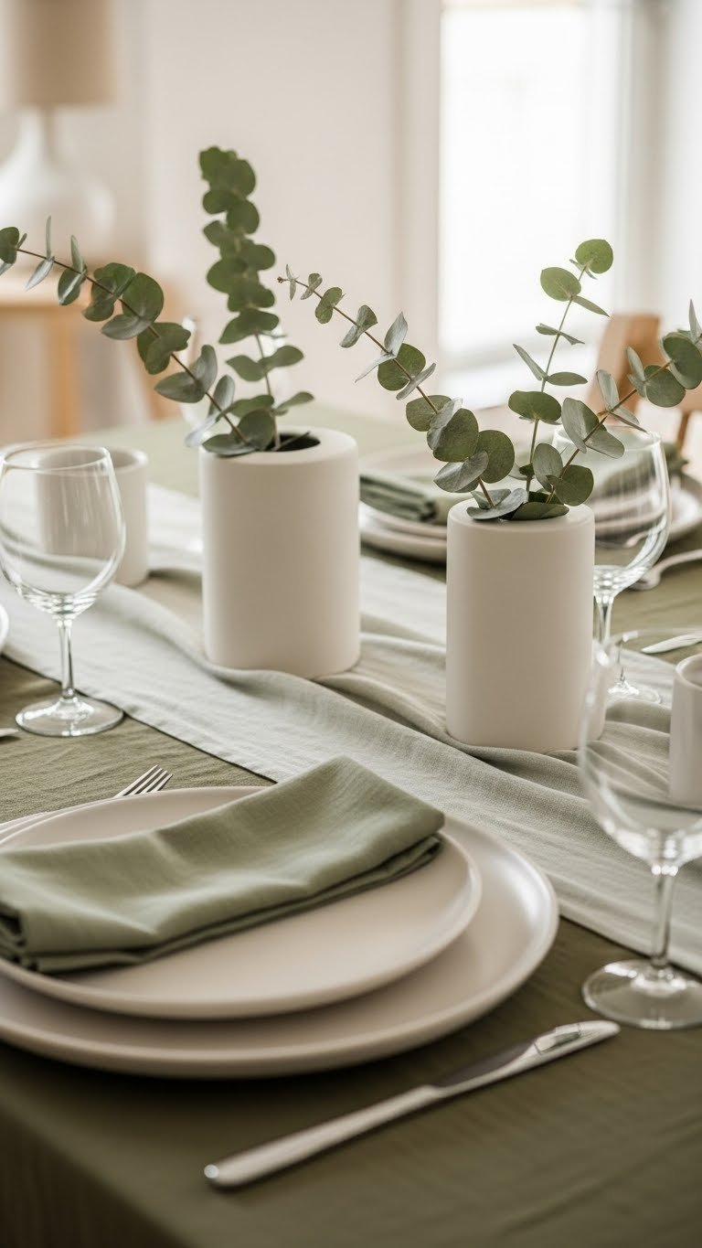 After you’ve settled a soft reading corner, carry that calm into the dining area with a pared-back table scheme anchored by muted greens. You’ll layer olive linens over a simple runner, place sprigs of muted eucalyptus in low vases, fold sage napkins neatly, and serve on matte dinnerware. The result feels intentional, airy, and free—subtle seasonal color without clutter.