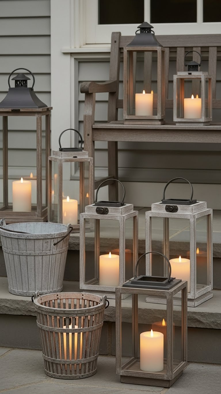 A handful of neutral lanterns with warm flameless candles will instantly lift your porch into a calm, welcoming space—think weathered wood or matte metal finishes that read timeless against winter pale.