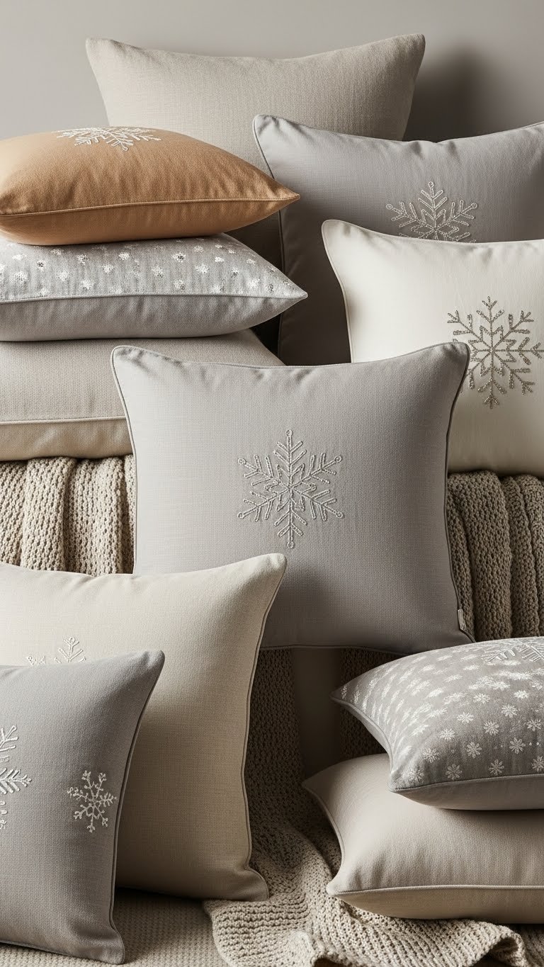 Pile pillows in layered heights to add depth and a soft focal point—choose neutral linens in oatmeal, dove gray, and warm ivory, then introduce subtle snowflake motifs in low-contrast embroidery or tone-on-tone jacquard.