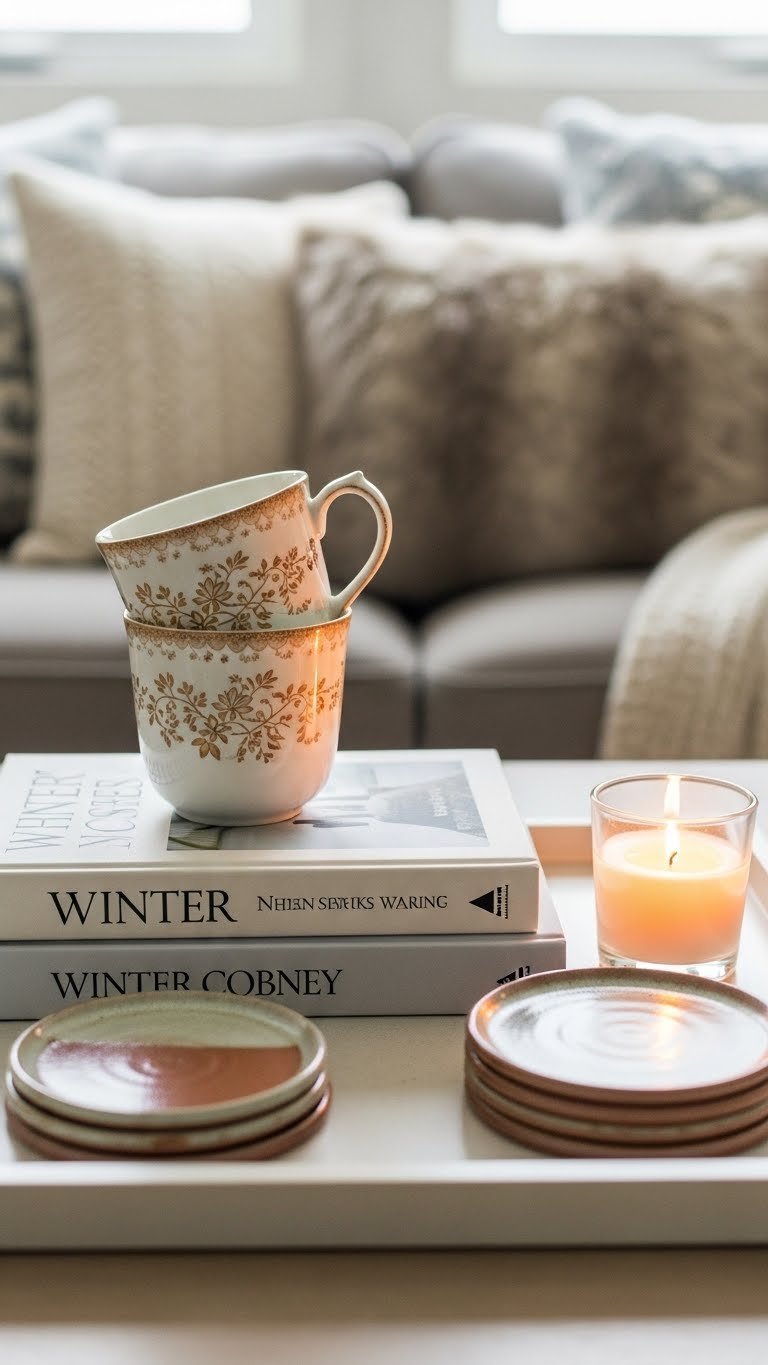 Stack two neutral covers, top with a vintage mugstack for character, add a small candle and a ceramic coaster set for function.