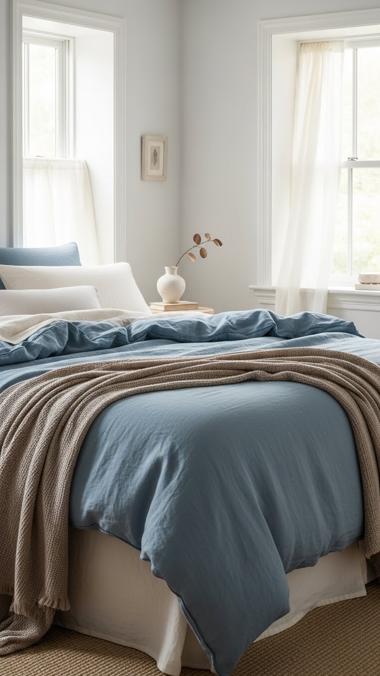 When you swap stark whites for a misty blue duvet paired with creamy sheets, your bedroom instantly feels calmer and more collected; the cool, muted blue grounds the space while the warm cream softens light and skin tones.