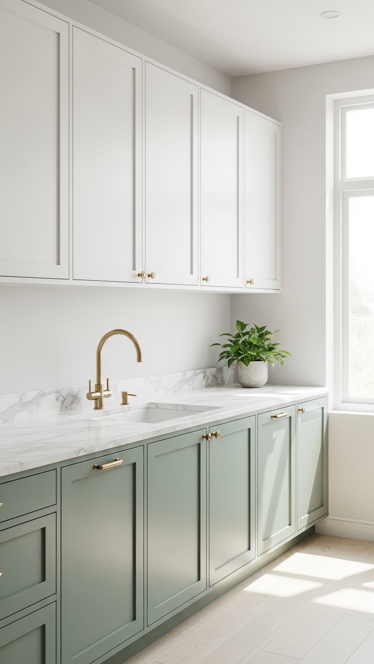 Balance is everything in a kitchen with sage green lower cabinets and white uppers: the soft, grounded hue on the base units anchors the room while the crisp white above keeps sightlines open and the space feeling airy.