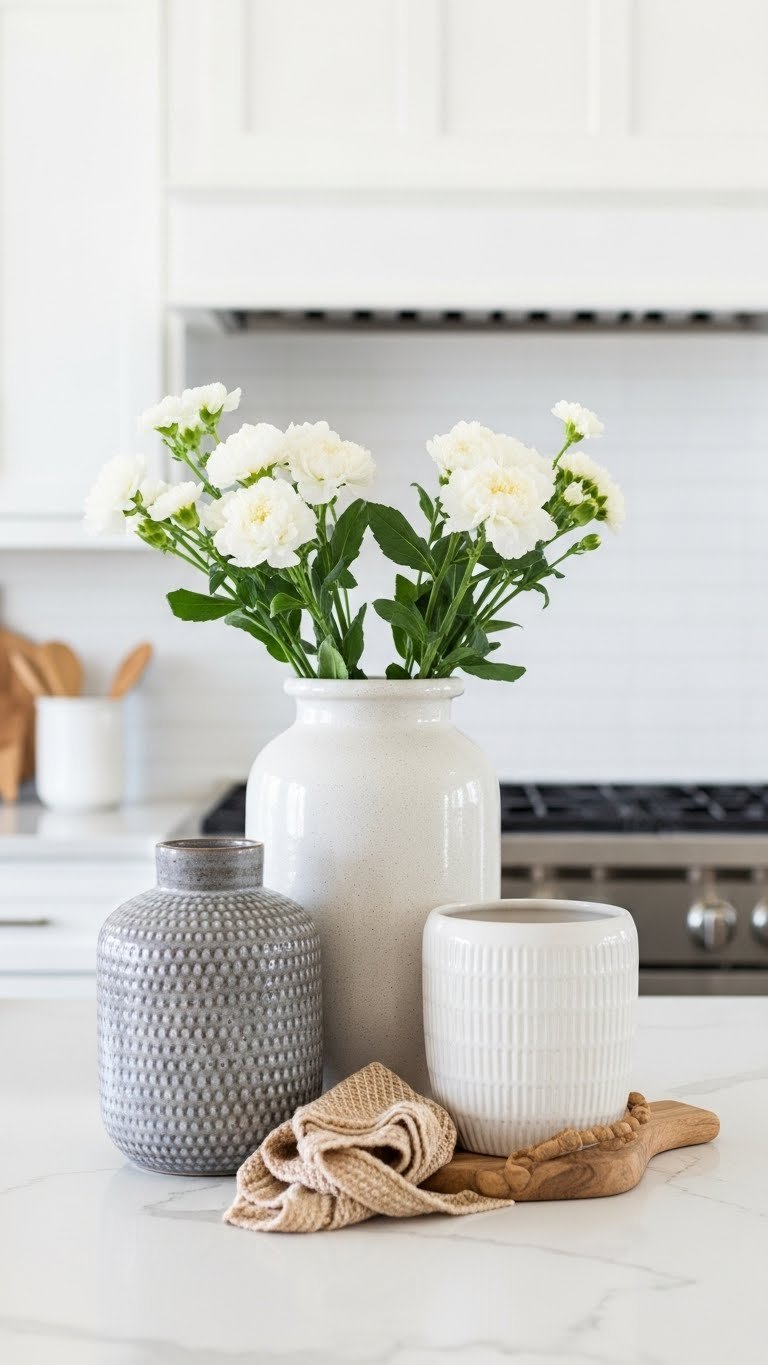 A trio of blush pink ceramic vases on open shelves instantly softens a kitchen vignette and draws the eye without overwhelming the room. You’ll love the matte finish that reads modern yet gentle.