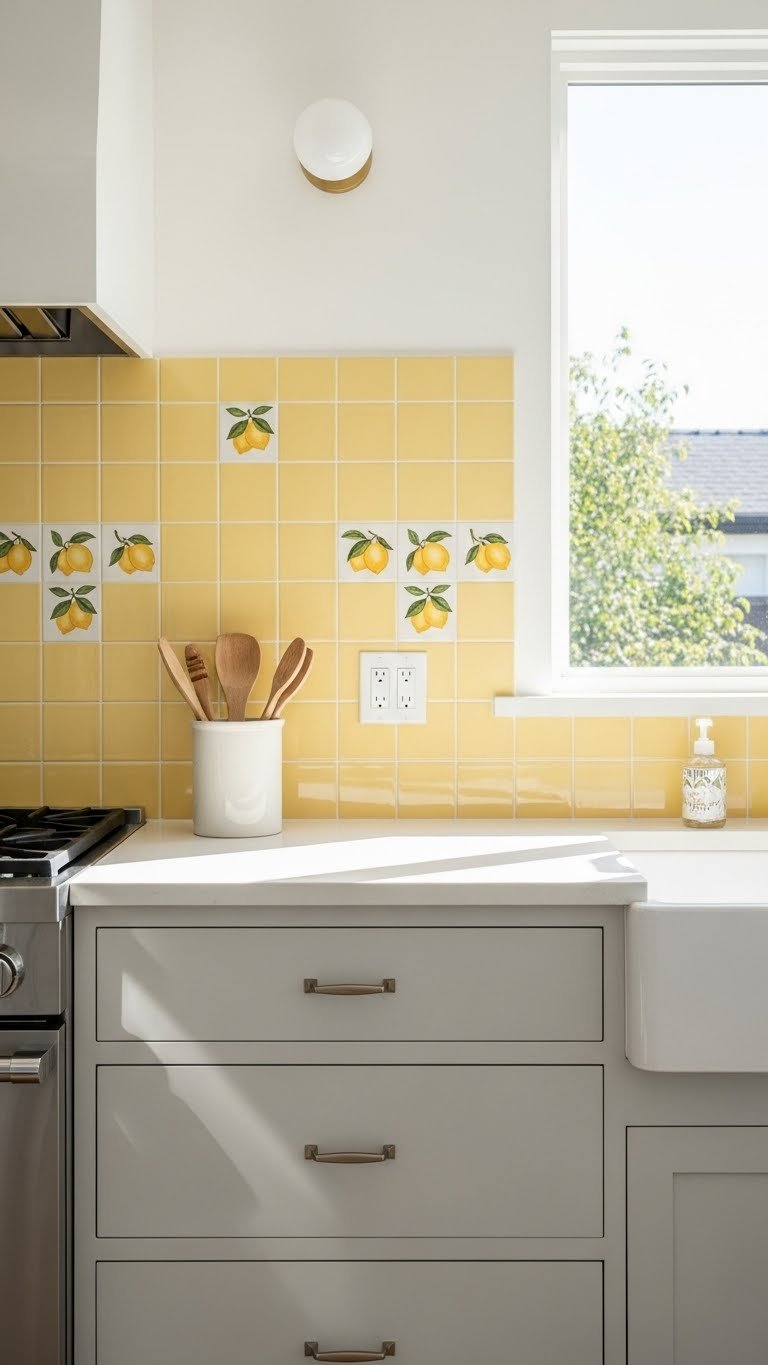 Because kitchens benefit from a subtle, sunny touch, try a soft butter yellow tile backsplash to lift the space without shouting. You’ll pair vintage lemon tiles with matte buttercream grout for a soft, lived-in glow.
