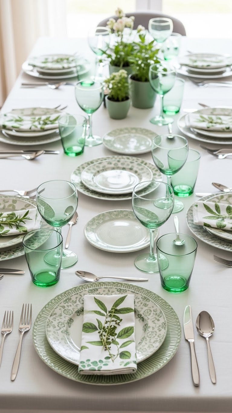 Pair mint green glassware with patterned plates to instantly lift your table setting—mixing soft translucence with bold motifs creates a layered, modern look that feels fresh and intentional. Let mint glassware and vintage glassware share shelves; contrast intricate patterned plates with plain linens. Tie the palette together using botanical napkins and open layouts so you can rearrange freely and enjoy a breezy, confident table.