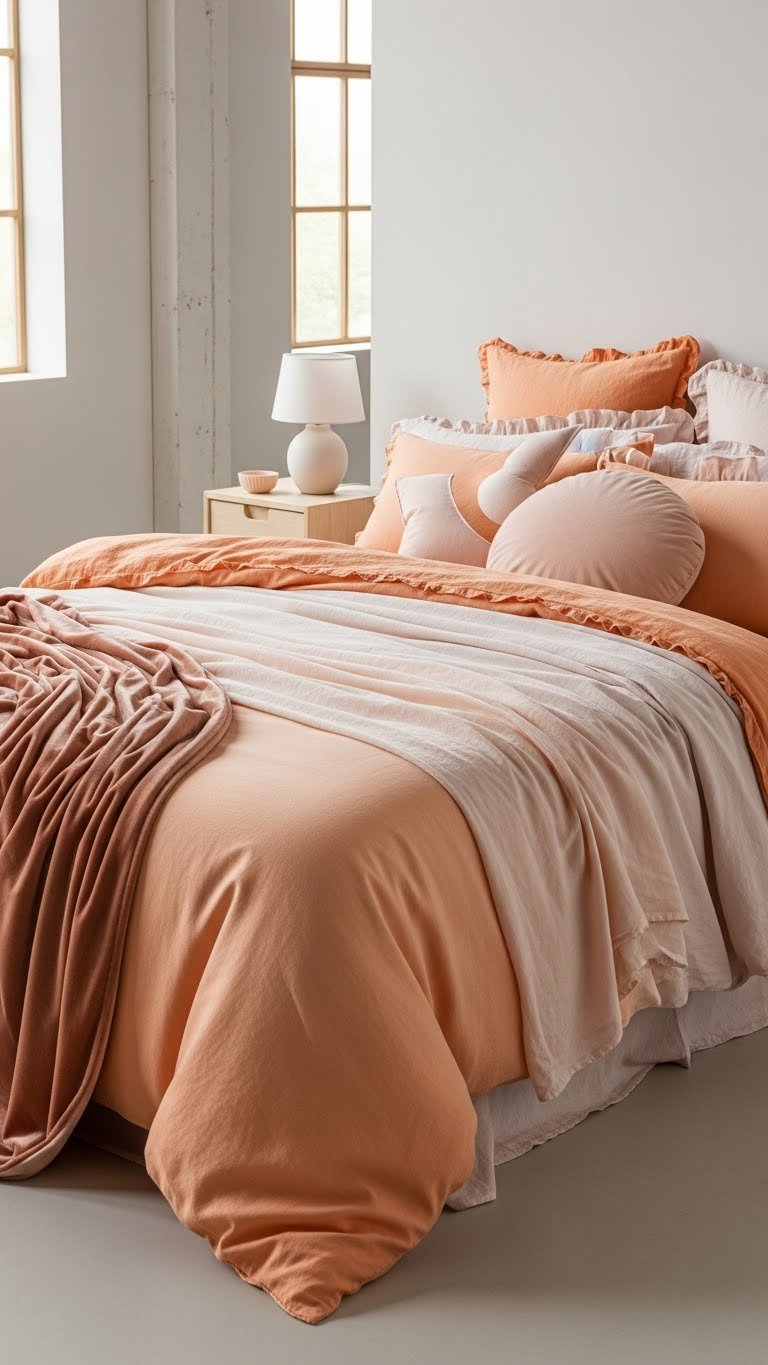 You’ll mix a soft peach gradient duvet with blush textures—linen, velvet, ruffled cotton—then add lightweight throws and sculpted pillows.