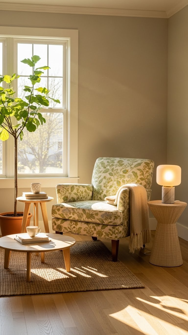 Choose vintage upholstery for texture, pair with sculptural side tables, and add warm accent lighting so you can relax, read, and move freely in a joyful corner.