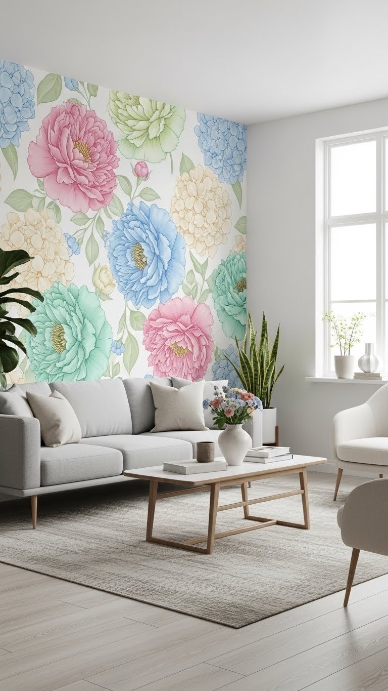 Bring oversized botanicals in to create an instant statement wall that anchors the room and sets a soft, springtime mood. You’ll play with botanical scale—huge petals, airy negative space—so an oversized blossom reads like art, not clutter.