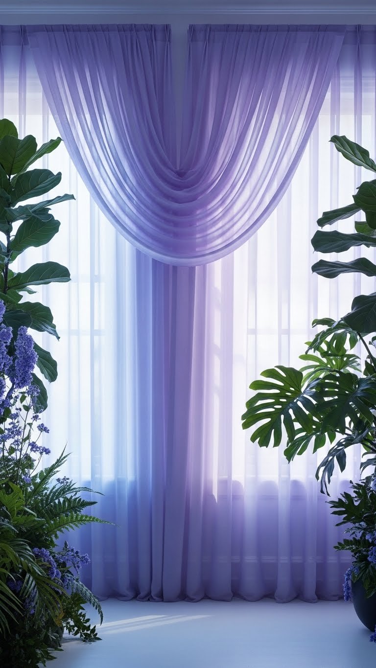 After anchoring the room with oversized botanicals, soften the light and amplify that springtime hush with pale lavender curtains that filter sunlight into a cool, dreamy glow. You’ll choose a lavender sheer for gentle light filtering while an optional lavender lining adds privacy and UV protection.