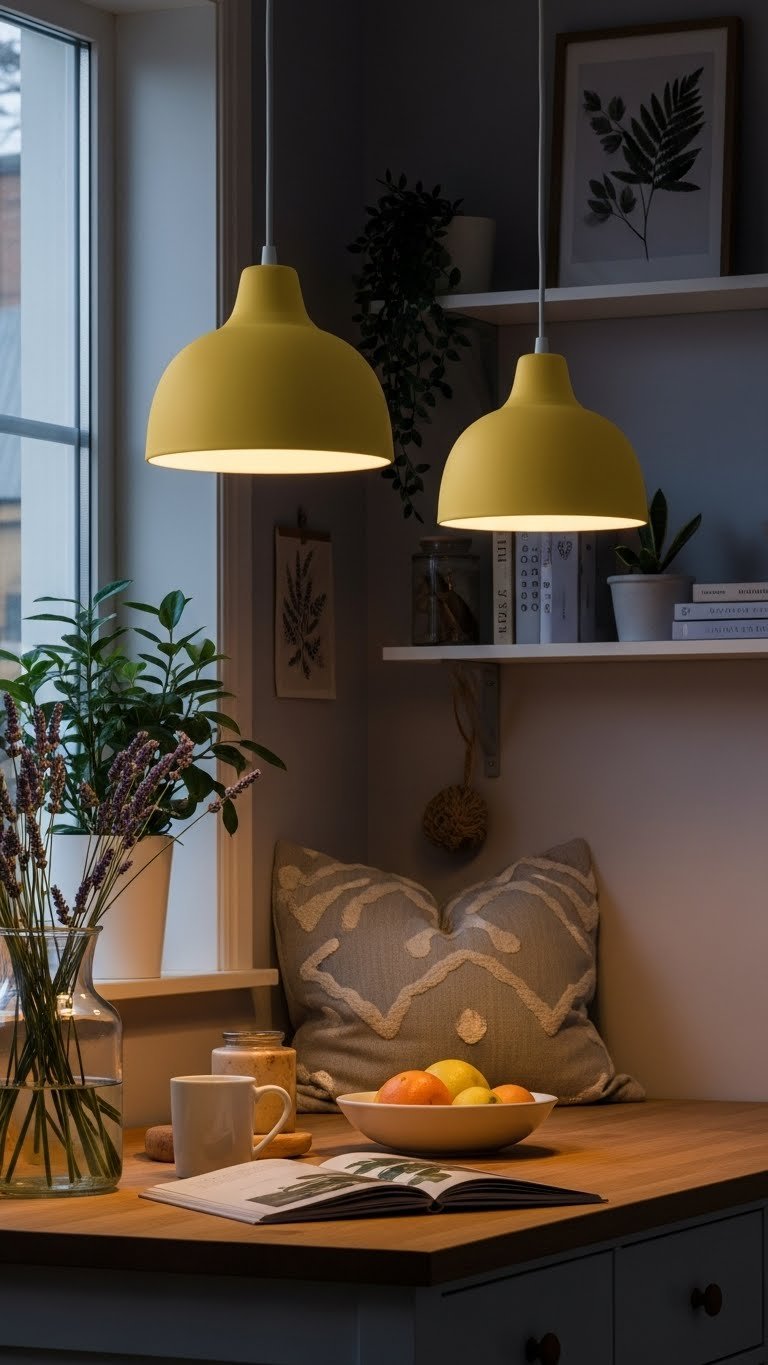 Hang soft yellow ceramic pendant lights to introduce a subtle, sunlit glow that ties springtime warmth to your pale lavender and botanical palette. You’ll choose pieces with a matte finish and clean curves so light scatters gently.