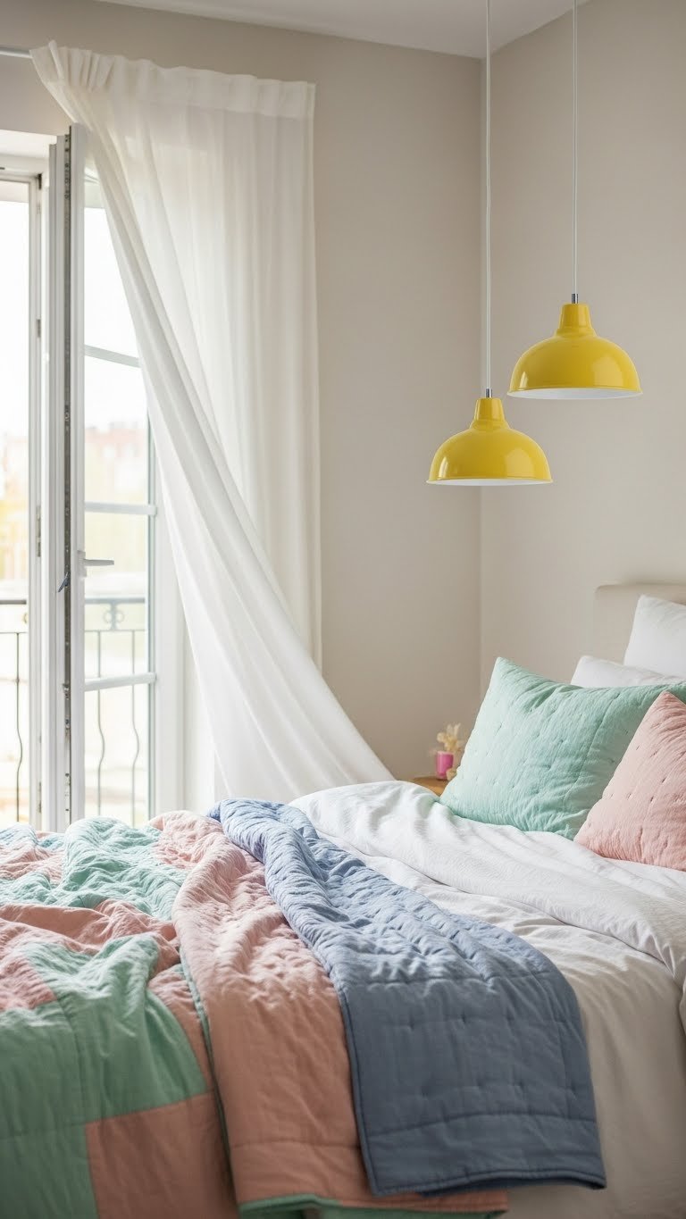 You’ll choose hand stitched quilts in soft mint, blush, or powder blue and layer them over crisp sheets. Airy sheers soften windows, invite breeze, and keep the space open—effortless comfort that feels free and intentional.