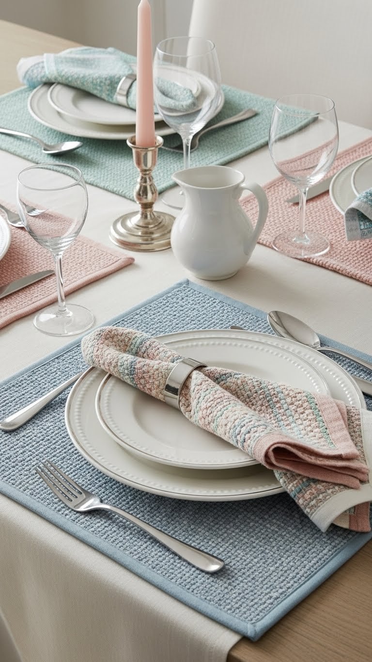 Layer textured pastel placemats under your dinnerware to instantly lift a table from plain to polished; woven linen, boucle, or hand-loomed cotton in muted mint, blush, or powder blue add tactile interest without overpowering the setting.