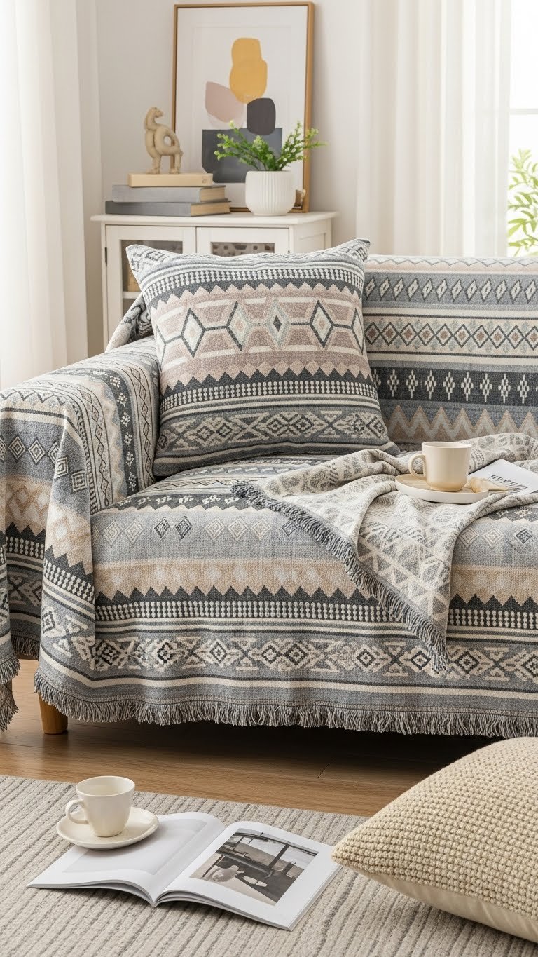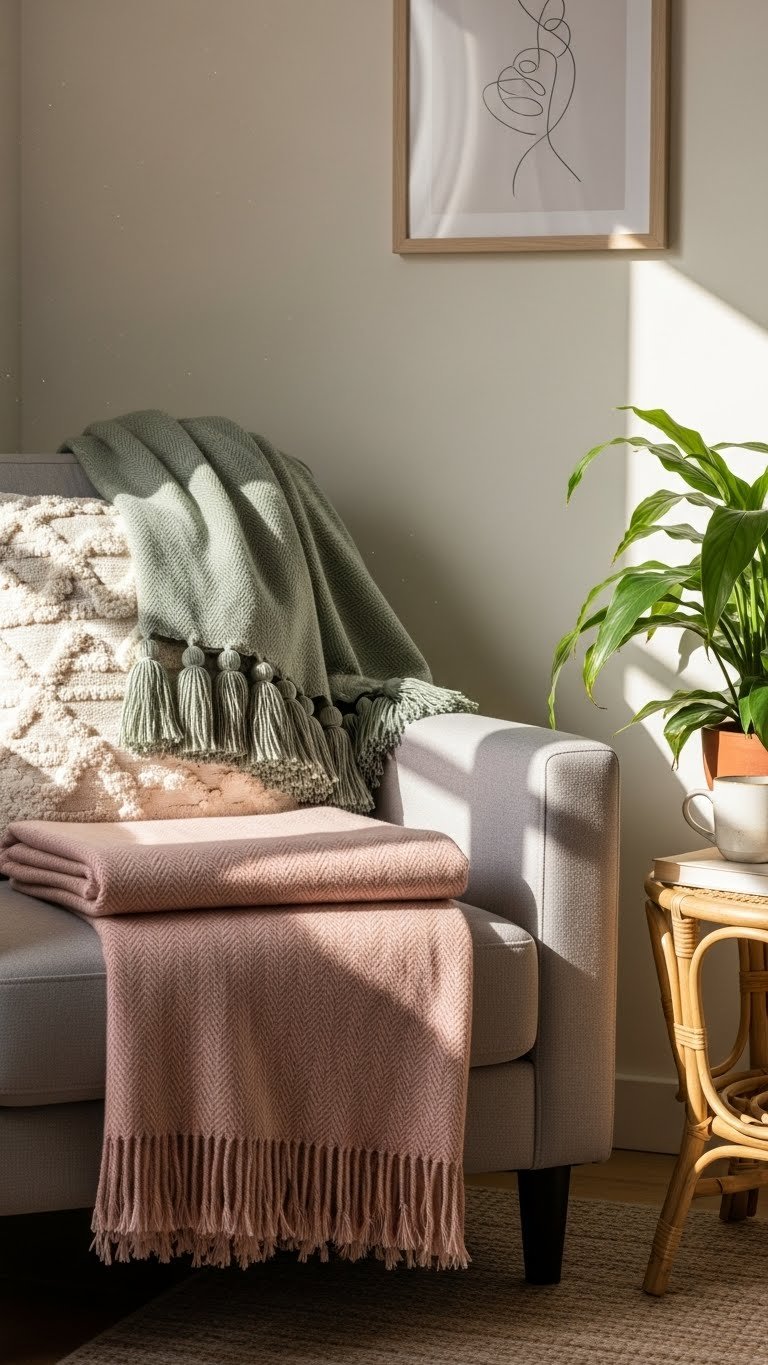 After the table looks inviting, bring that same tactile charm into a seating nook with sage and blush throws layered across a sofa or armchair.