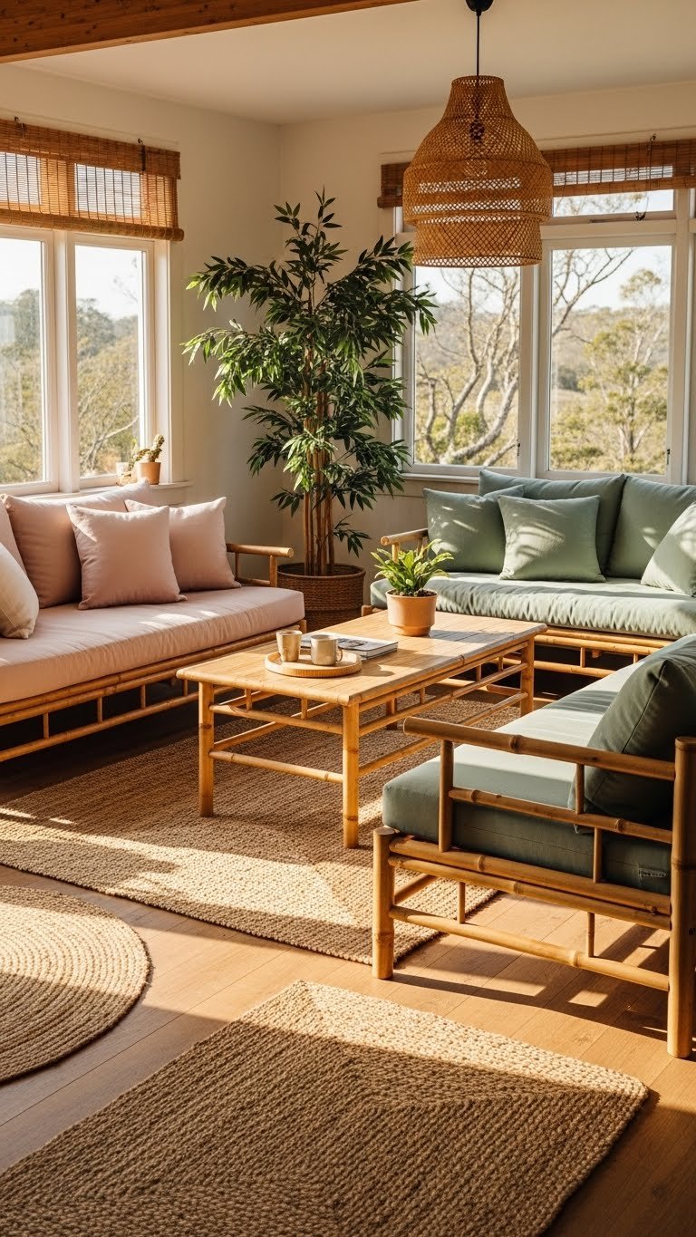 You’ll layer jute textures against muted blush or sage sofas, balancing tactile warmth and airy color. Choose clean-lined bamboo furniture, low silhouettes, and removable pastel covers so you can rearrange, breathe, and keep your space effortless and resilient.