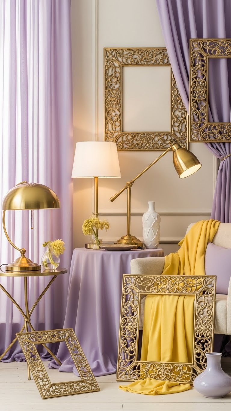 If you layer buttery yellow and pale lavender with warm metallics, you’ll give a room instant polish without losing its softness. Pair lavender chiffon drapes with brass lamps and metallic filigree frames to create airy glamour.