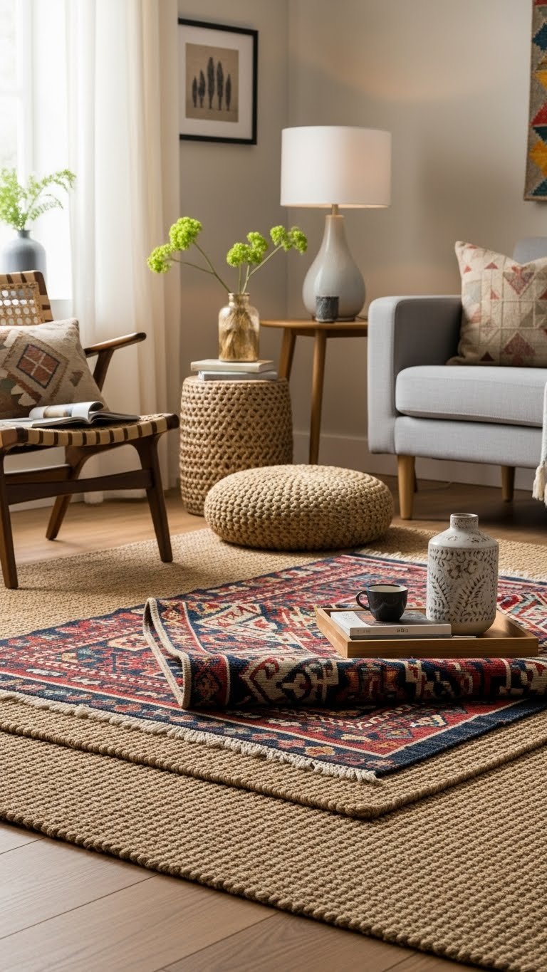 Layer woven rugs to anchor a room and give your floors depth and personality; start with a flatweave or sisal for grounding texture, then layer a softer, patterned wool or hand-knotted piece on top to introduce warmth and visual interest.