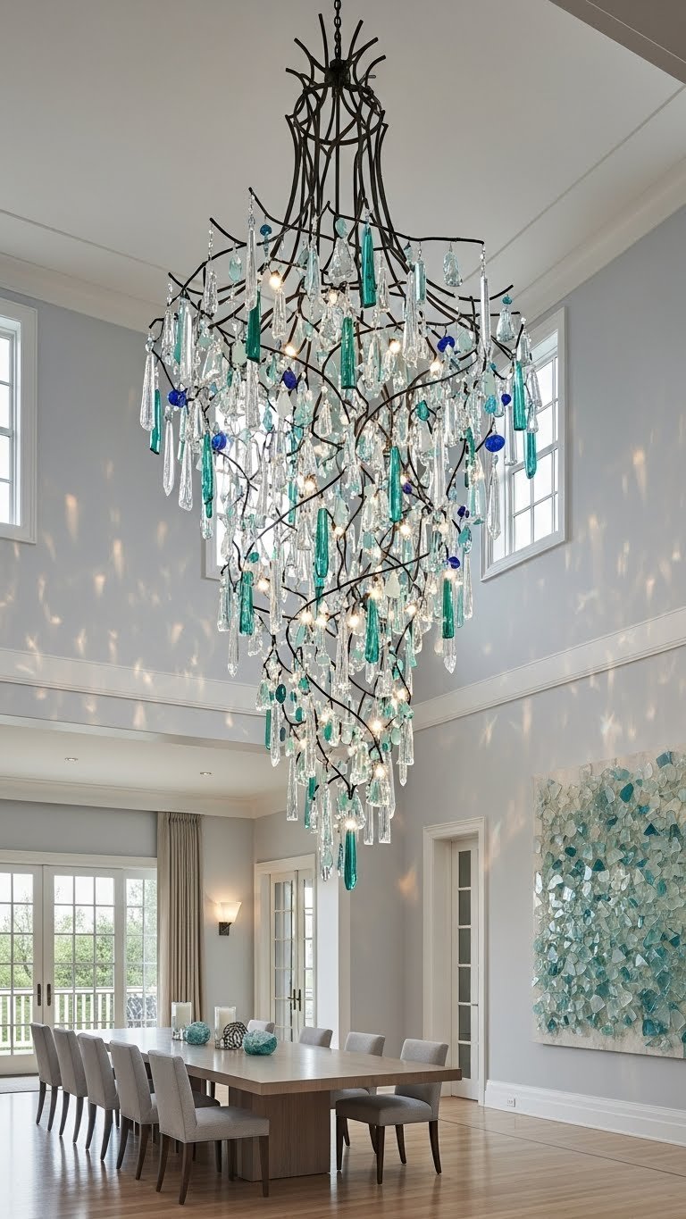 Choose hand forged frames and sea glass accents for tactile contrast, letting suspended clusters catch an ambient glow.