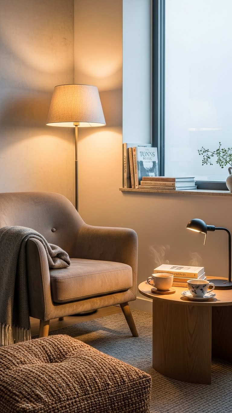 A cozy corner with a plush armchair and soft layered lighting invites you to linger with a book and a cup of tea.