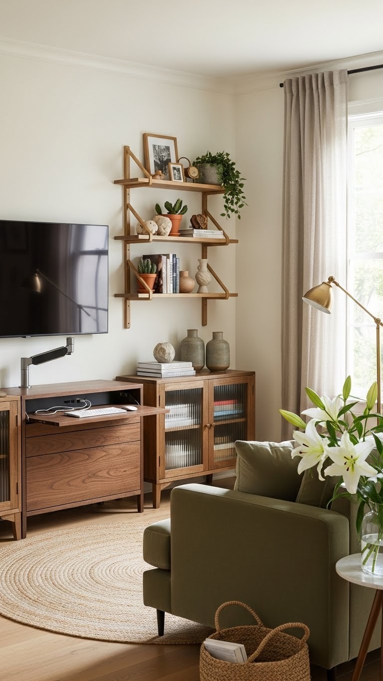 Think beyond boxes and let storage double as style: multifunctional elegant pieces tuck away clutter while anchoring a room’s look. You’ll choose hidden consoles that serve as sleek media hubs and console-to-desk hybrids, or embrace vintage cabinets reimagined with soft hardware and inner shelving.