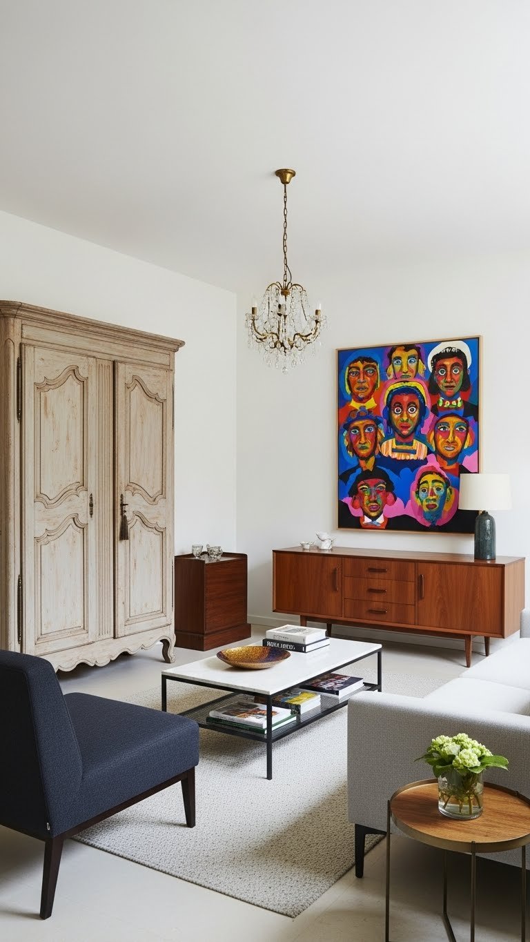 Start by layering pieces that carry history with those that speak to now—pair a gracefully worn armoire with a streamlined sofa, or tuck a mid-century credenza beneath a bold contemporary artwork.