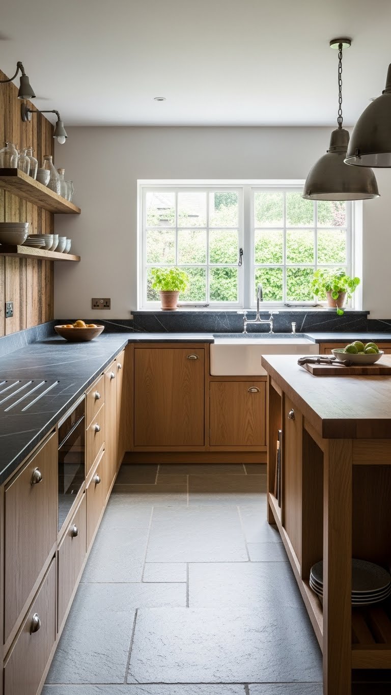Where wood brings warmth and tactile comfort, natural stone introduces cool, sculptural presence that balances the room. You’ll choose soapstone counters for their quiet depth, preferring a honed finish and soft tumbled edges that whisper craftsmanship. Keep honed seams minimal and precise so surfaces feel seamless and liberated. The result: elegant, durable counters that let your space breathe and move.