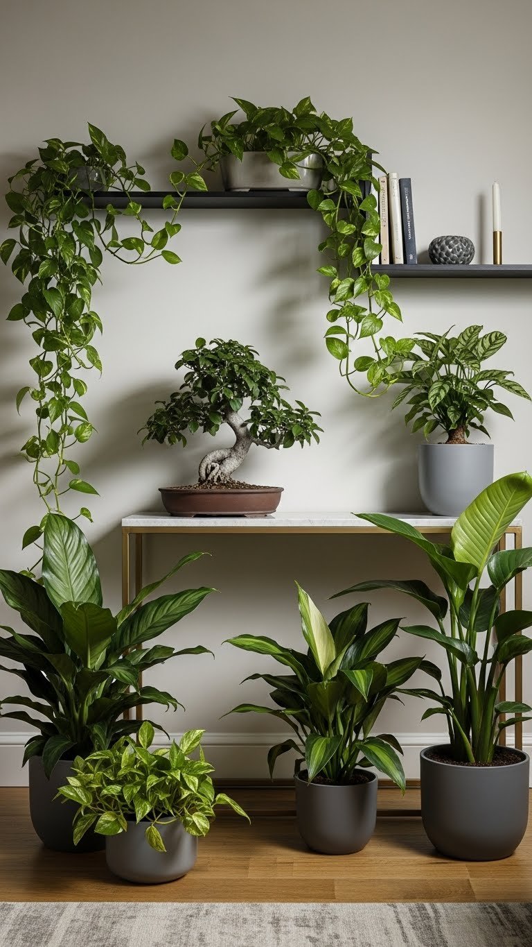 You’ll choose architectural pothos for sweeping vines and clean contrast, place bonsai focalpoints on consoles or windowsills, and mix heights for visual rhythm.