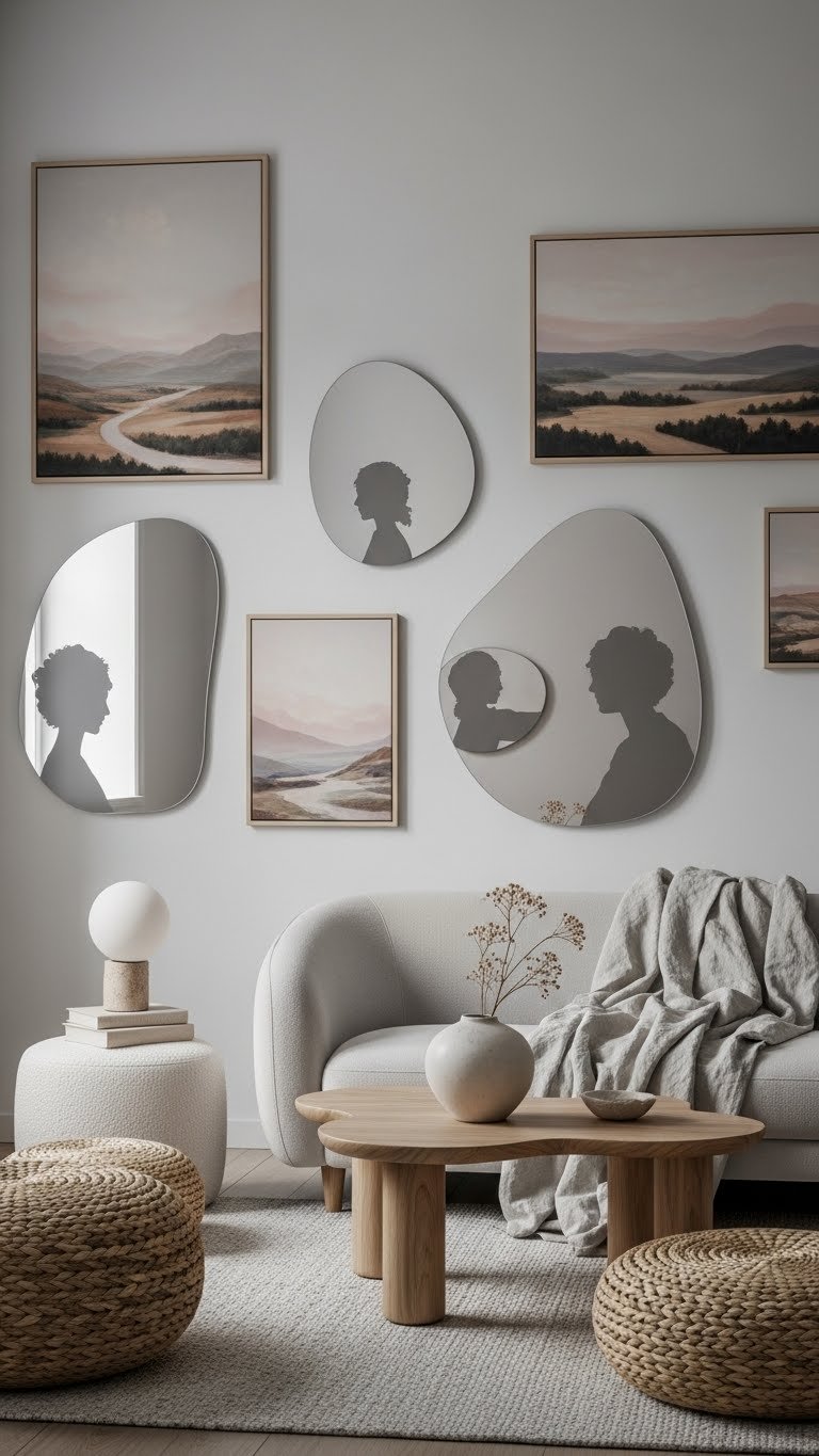 You’ll choose rounded frames that reflect soft light, pairing them with muted landscapes that whisper color rather than shout. This combo gives you open, gentle spaces that feel curated yet free, inviting quiet, confident living.