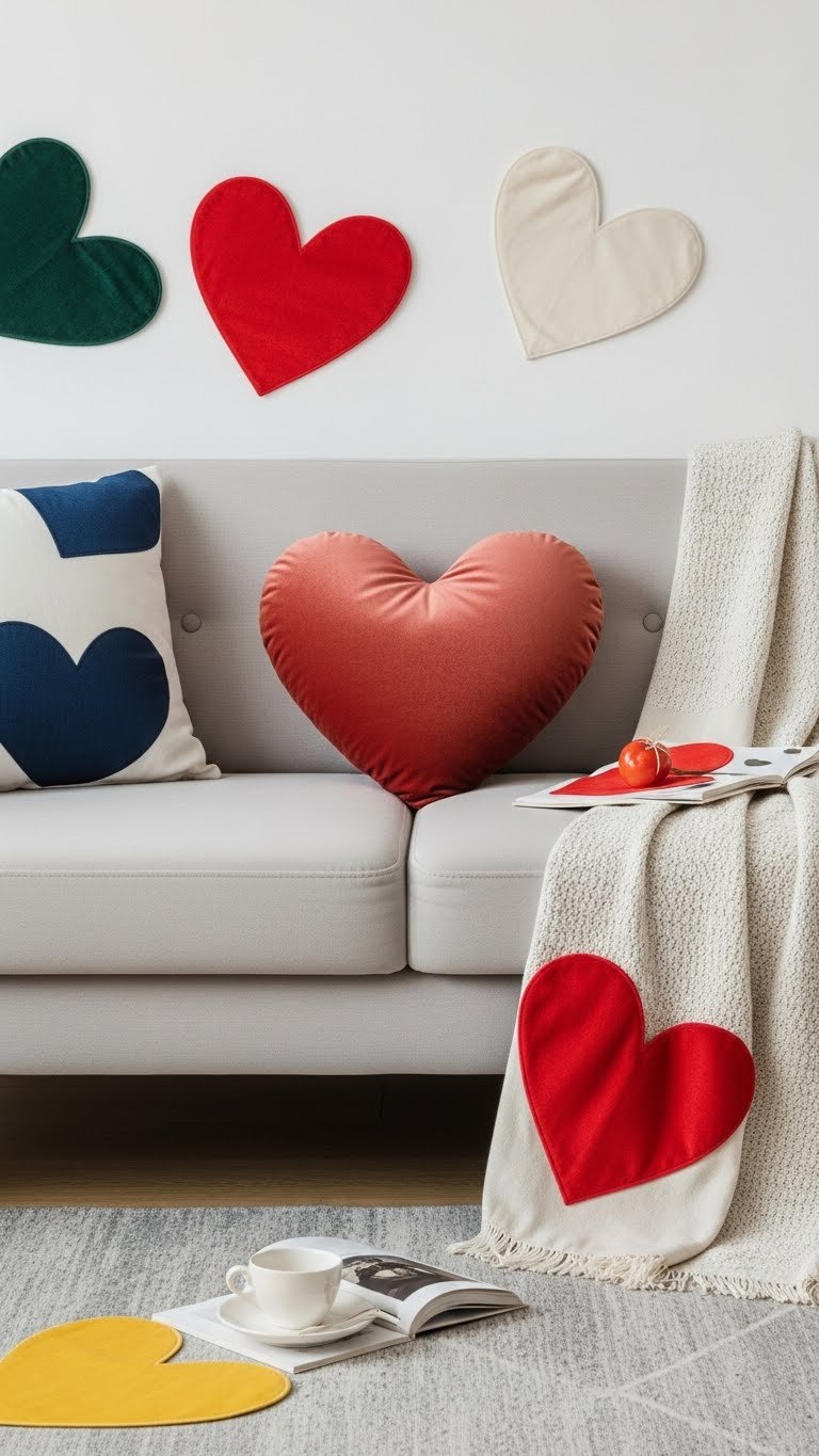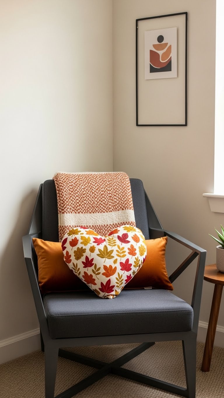 Bring a pop of playful romance to your corner by tucking a heart-shaped throw pillow into an accent chair, where its curved silhouette contrasts with angular lines and immediately softens the scene.
