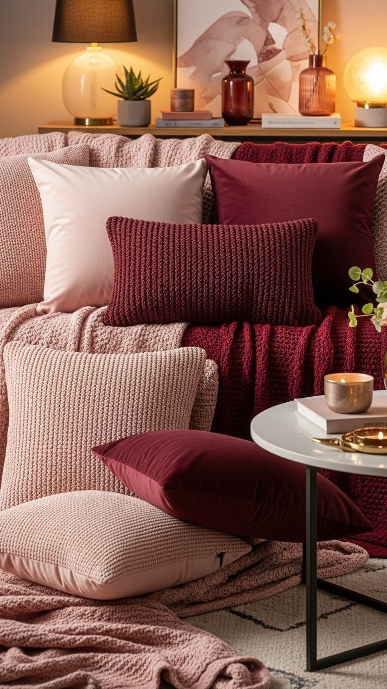 When you layer blush and burgundy pillows, you create a mood that’s both soft and sultry—the pale rose tones soften the deep wine hues, while rich textures keep the mix from feeling flat.