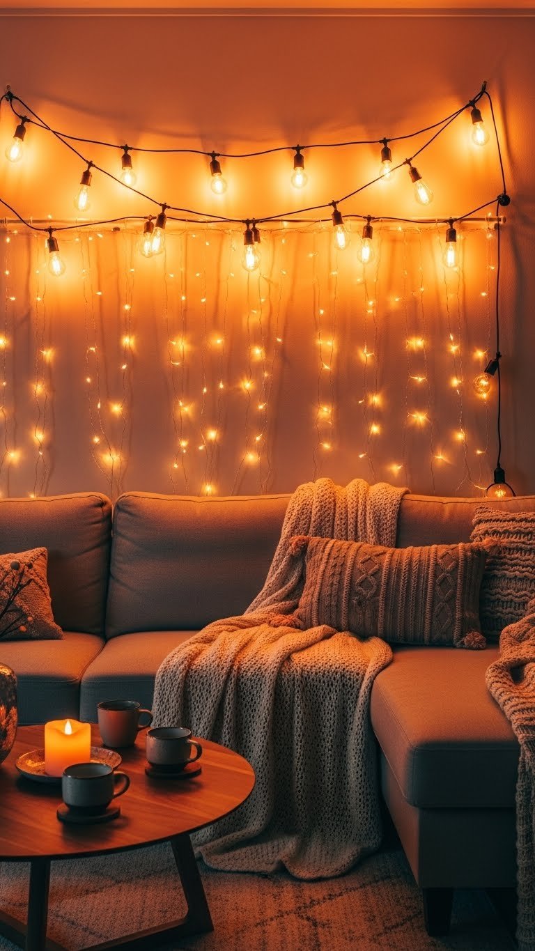 Across the back of your couch, layered string lights turn a simple seating area into an intimate glow-scape, their warm filaments weaving depth and softness that paint the wall with drifting highlights.