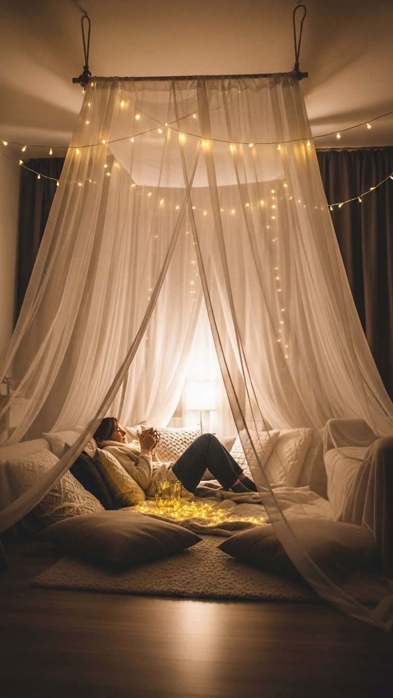 Drape sheer curtains from a simple canopy frame and watch your living room transform into an intimate, light-diffused hideaway that feels like a grown-up sleepover.