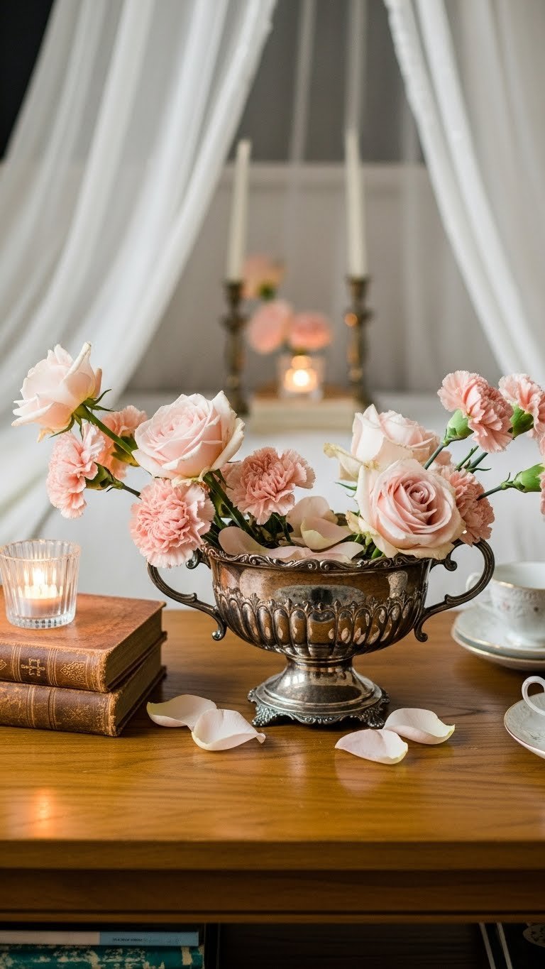 You’ll arrange blush roses and ruffled carnations in an antique vase, trim stems for a loose, lived-in shape, and top with fragrant water. It feels curated, effortless, and confidently free.
