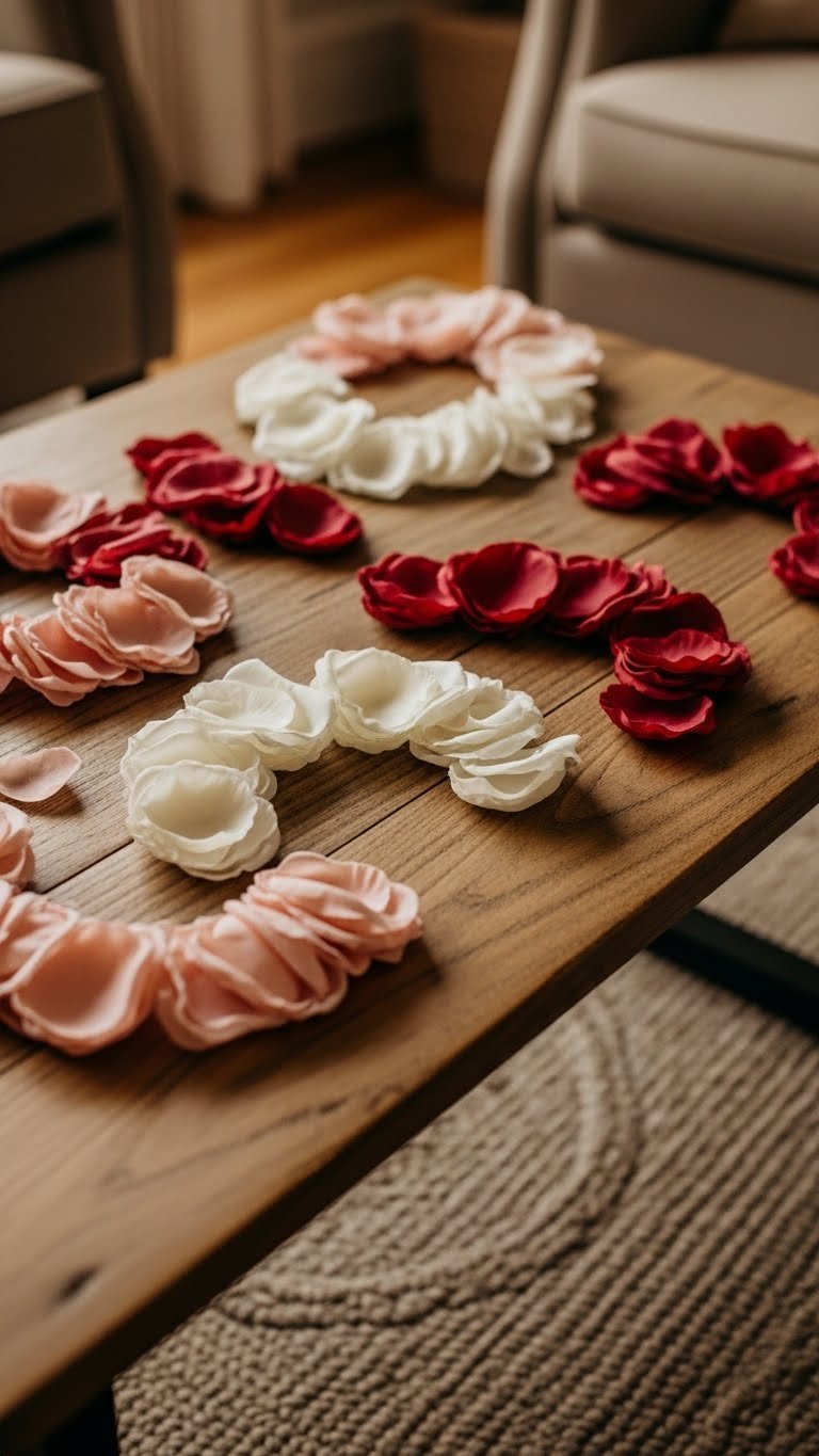Scatter a whisper of faux rose petals across your coffee table and rug to introduce a quiet, wearable romance that reads intentional, not staged. You’ll sprinkle scattered petals in artful arcs, favoring off-center clusters and negative space.