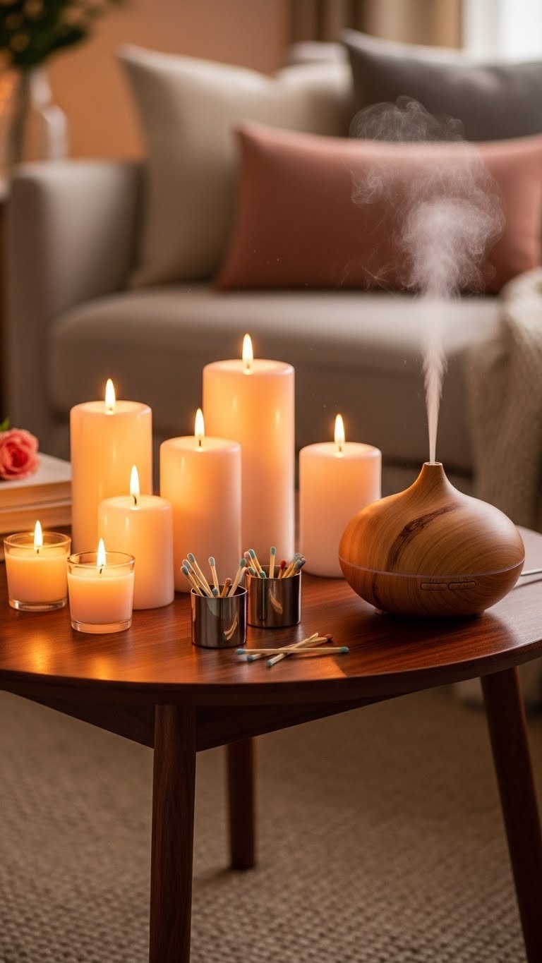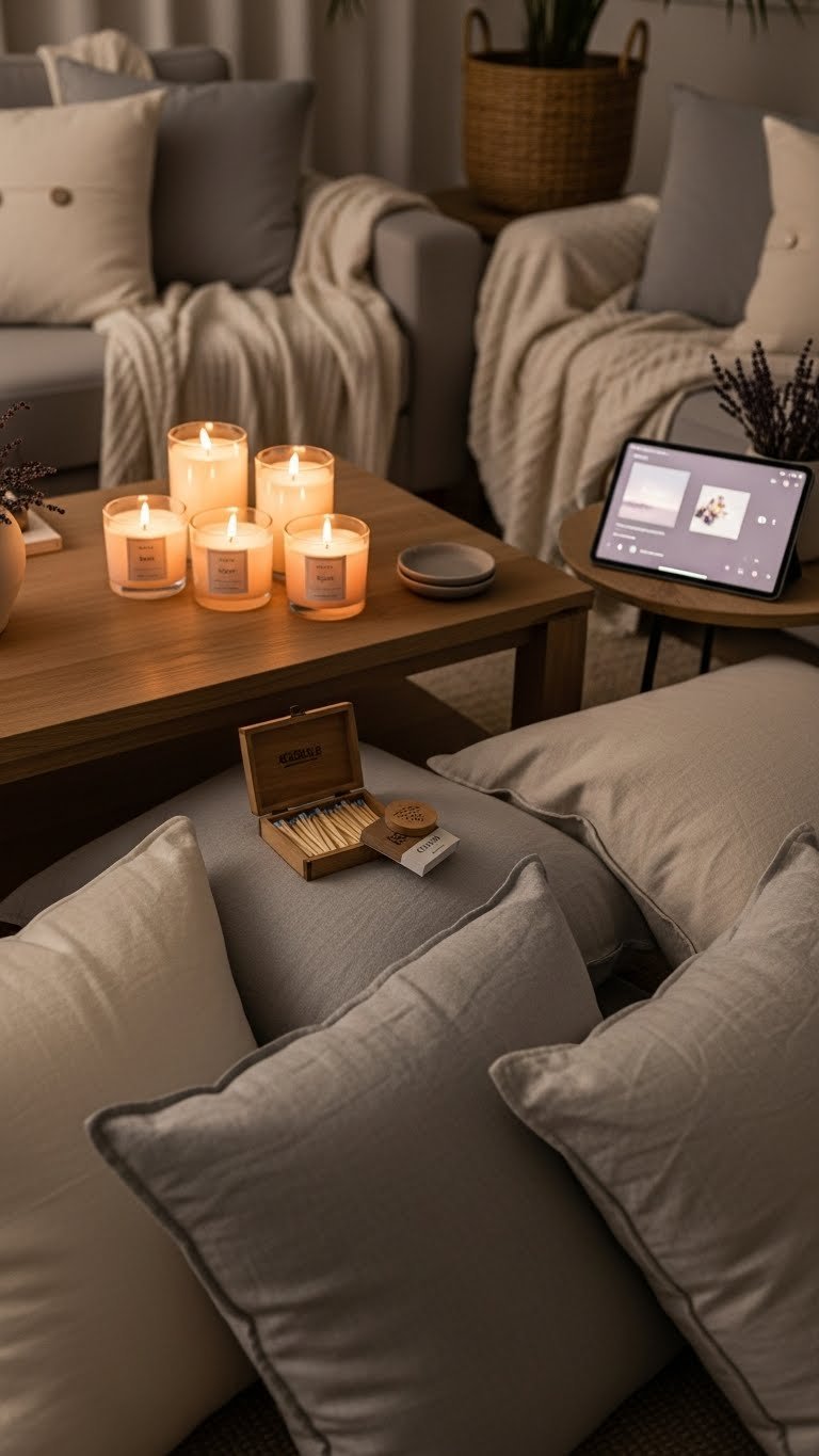 You’ll balance aromatic soy votives with a rosewood diffuser for depth, practice spa layering by varying burn times and heights, and keep matchstick holders nearby for ritualized lighting—liberating, chic, effortlessly personal.