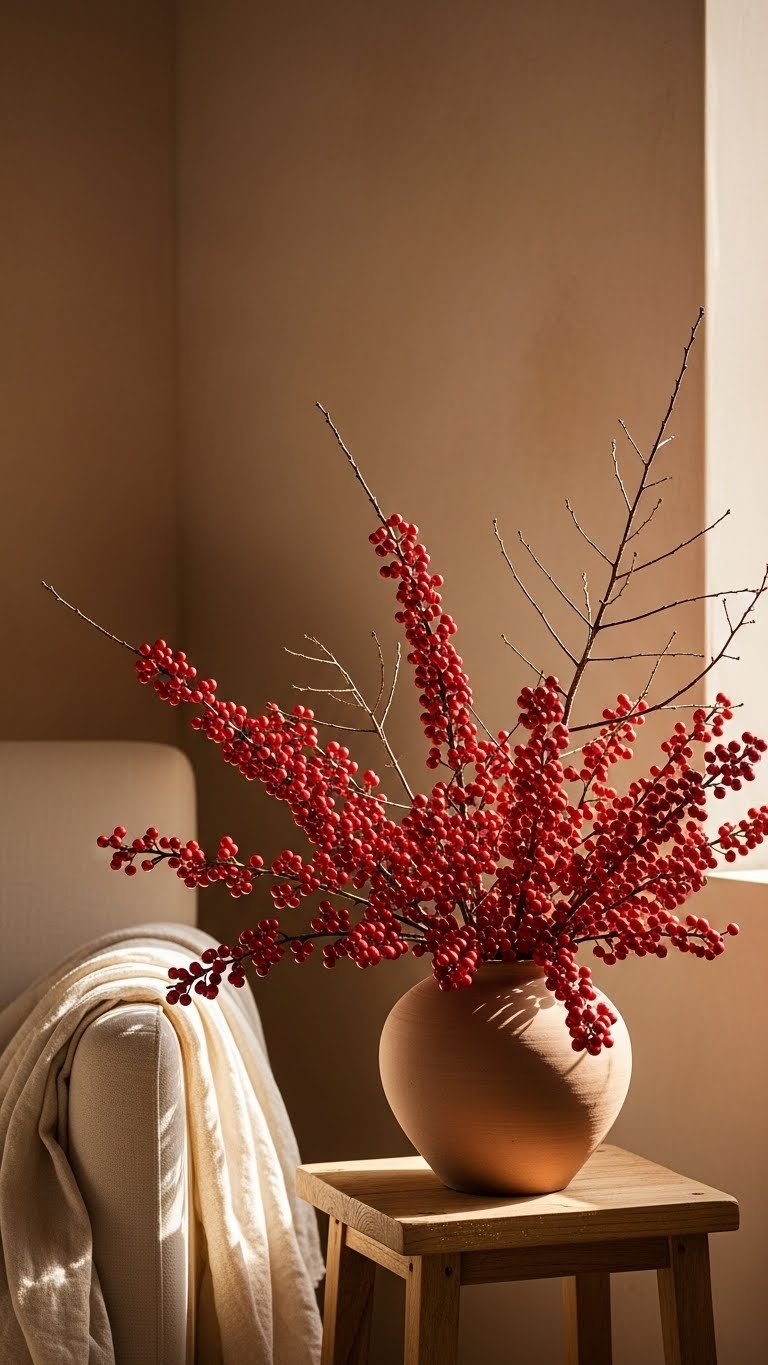 Against a backdrop of warm plaster walls, crimson berry branches in an earthen vase bring instant drama and texture to your living room: their glossy clusters and spiky stems contrast the soft linens and muted tones, while the vase’s matte clay grounds the arrangement with organic weight.