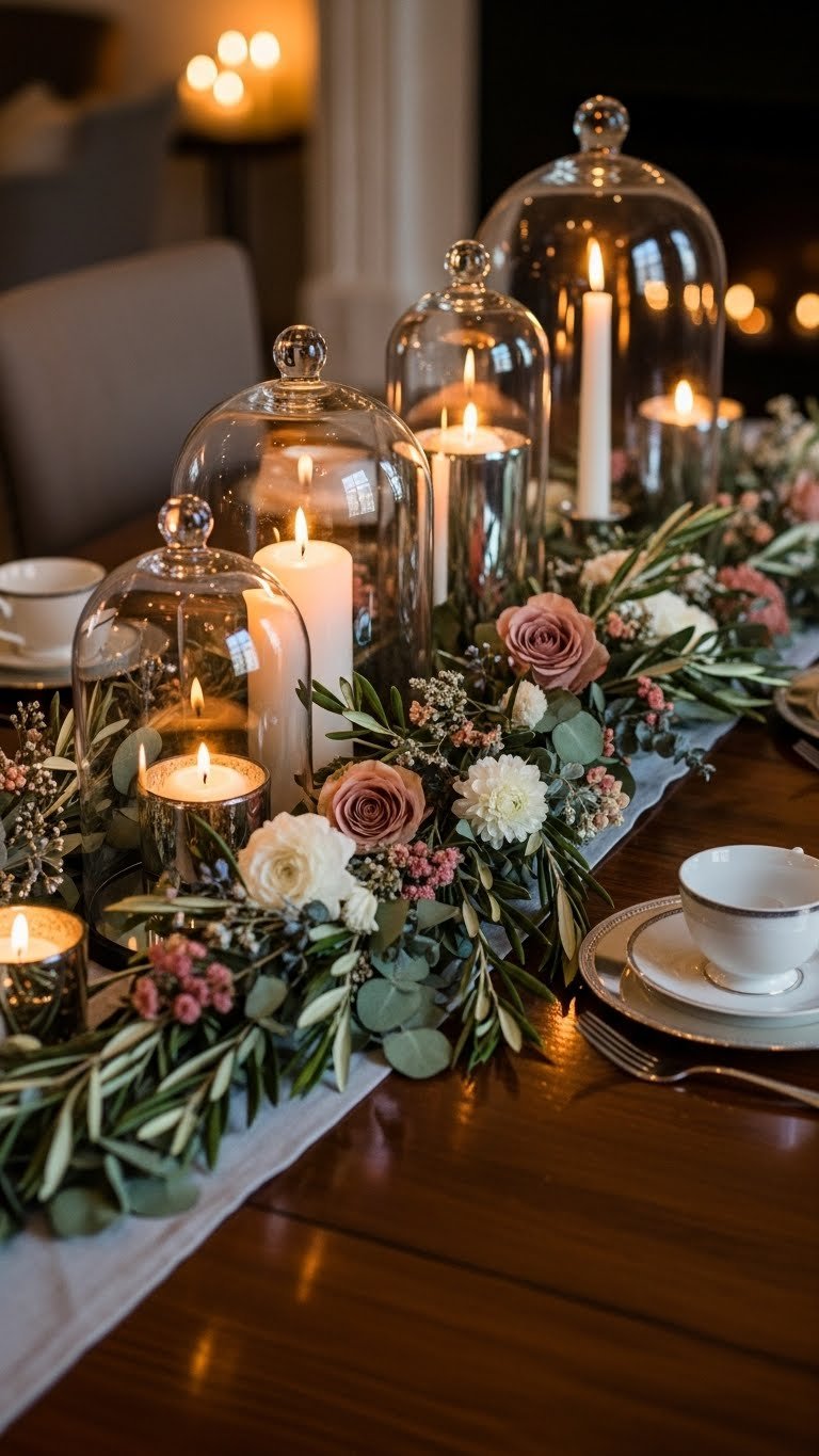 Framed beneath soft glass domes, a floral garland wrapped around a cluster of candles turns a tabletop into an intimate vignette you’ll want to slow down and savor.