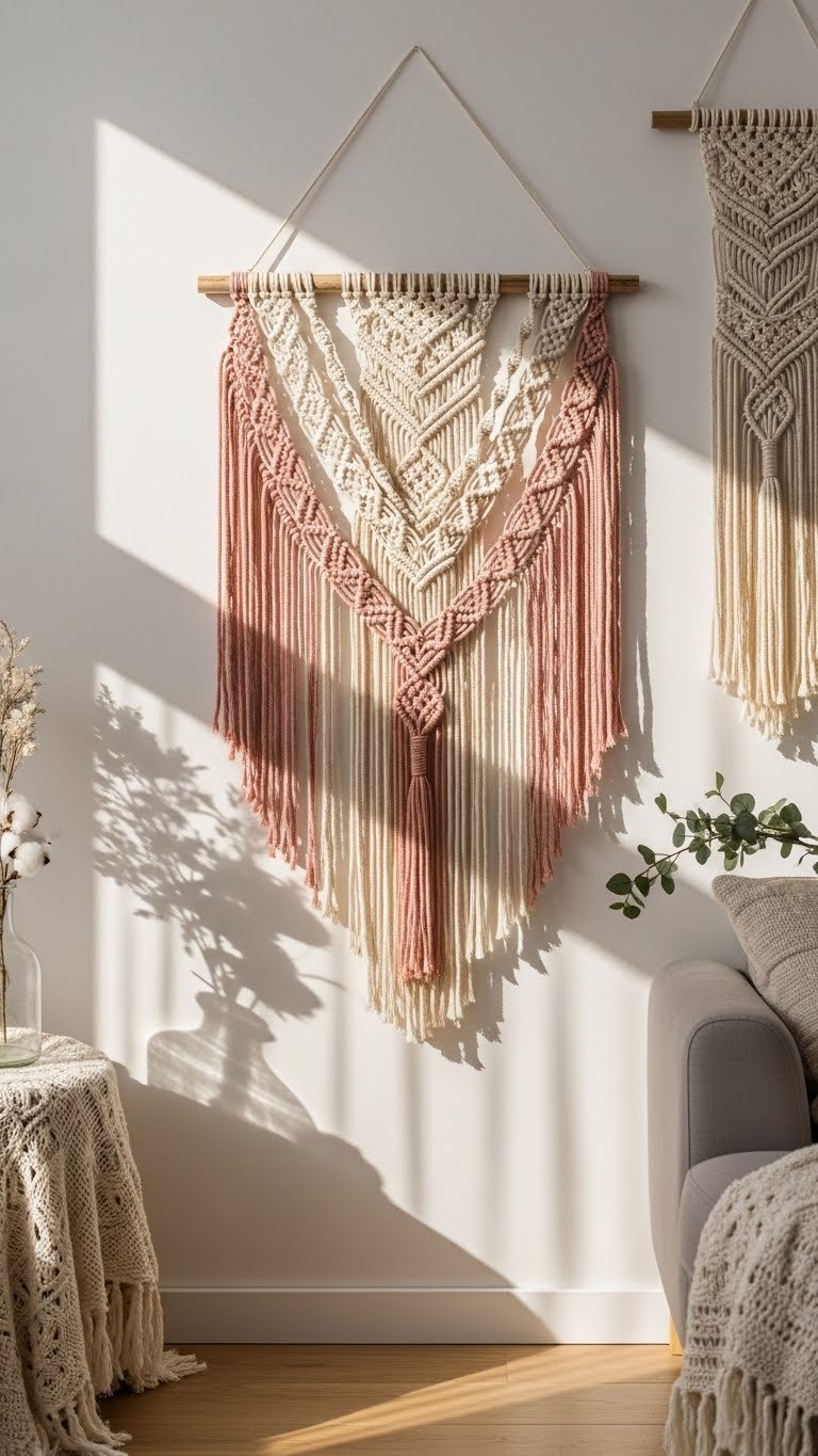 You’ll hang it where light brushes knots, savoring macramé symbolism—intertwined lives and open paths.