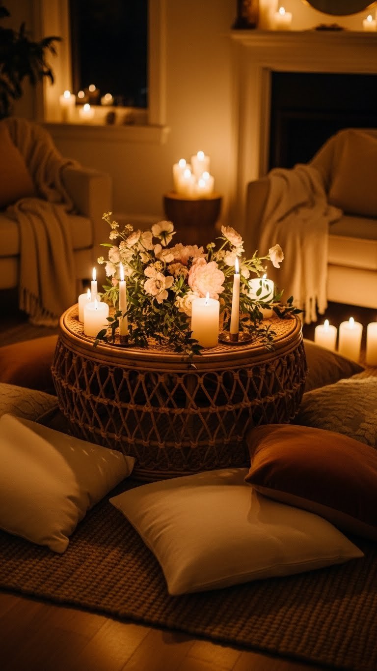 You’ll style a casual candle arrangement, scatter cushions, and place a loose, fragrant flower centerpiece.