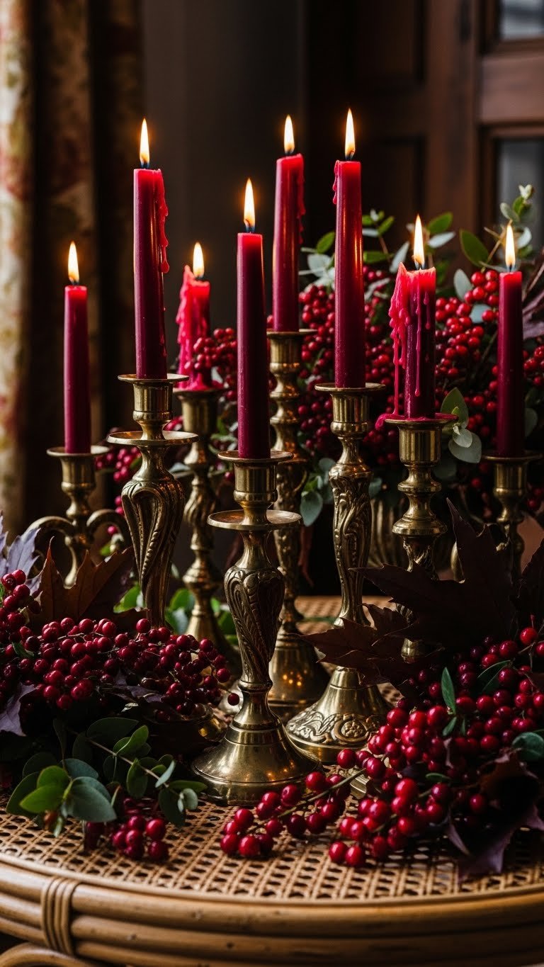 Move the eye from the soft rattan tableau to a cluster of vintage brass candle holders that anchor the room with old-world glamour; their burnished patina and sculptural silhouettes contrast the casual picnic vibe while lifting the whole scene. You’ll pair antique brasswork with cranberry bouquets and patina accents, nestling velvet tapers to cast warm pools of light that feel indulgent and liberating.