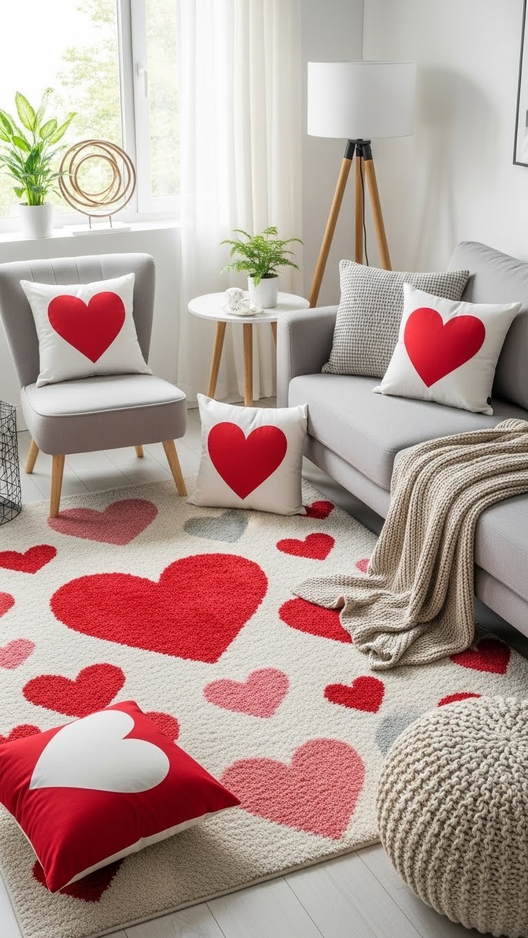 Tuck a heart-themed accent rug under your seating area to instantly center the room and give your scheme a playful, romantic heartbeat. Choose a piece with cozy texture that invites bare feet and a modern scale of hearts so it reads chic, not childish. Layer neutrals, let bold cushions echo the playful pattern, and keep furniture loose for an airy, liberated vibe.