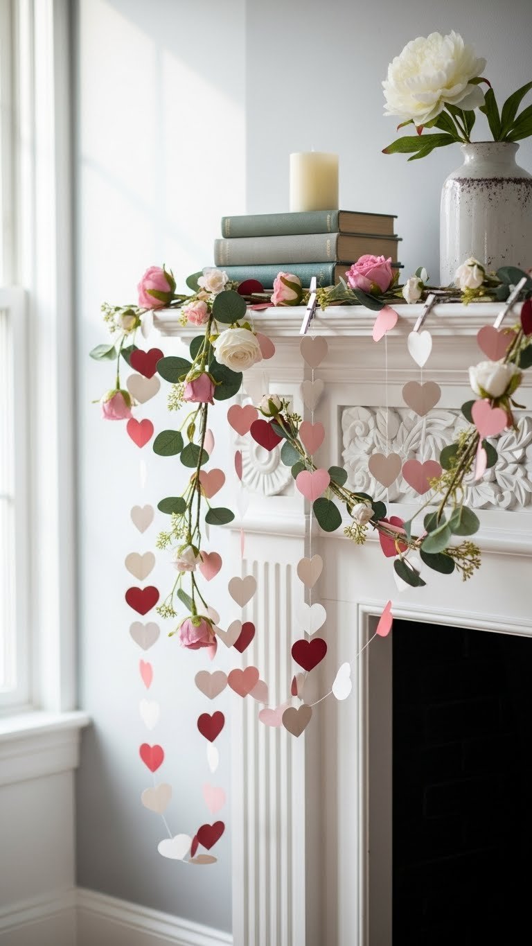 Around a mantel or headboard, weave strands of paper hearts and faux blooms to give the space an instant handcrafted romance. You’ll mix a playful paper heart bunting with a lush faux flower garland, draping asymmetrically for airy movement.