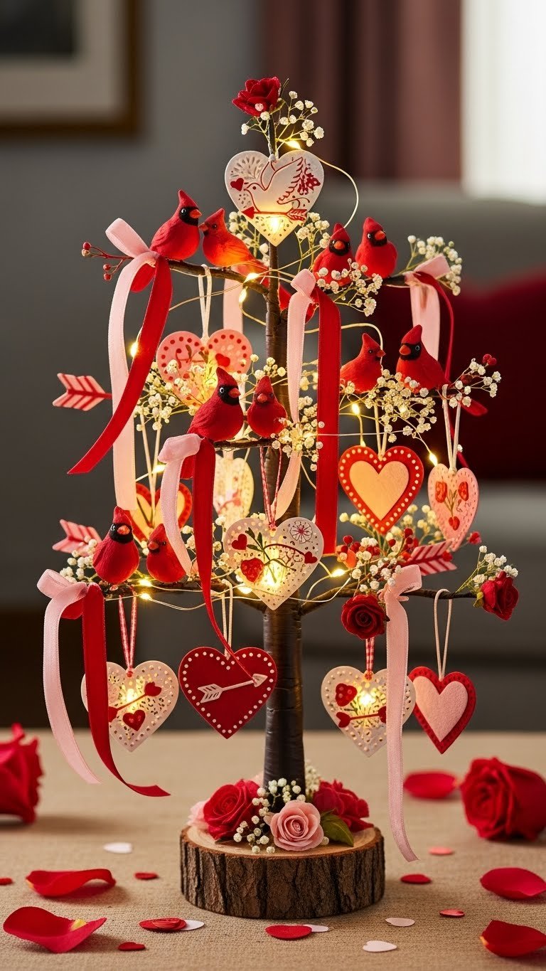 If you loved the handcrafted charm of paper hearts and faux florals, bring that same whimsical energy to a compact centerpiece: a mini Valentine’s tree dressed with tiny light-up ornaments and a pair of red cardinals.