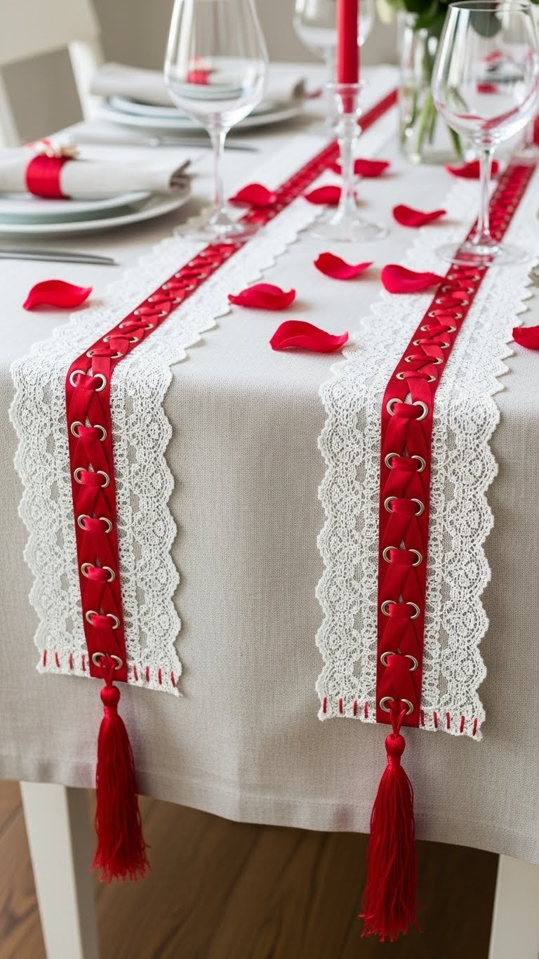 DIY Romantic Table Runner With Lace and Red Ribbon