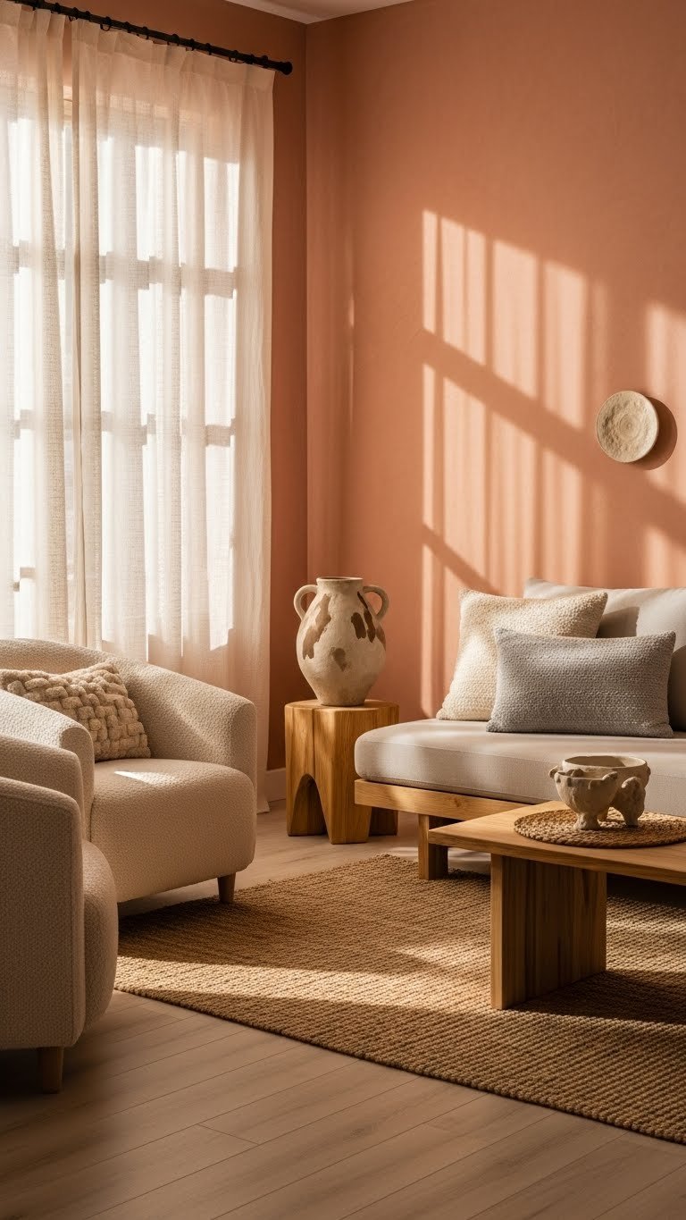 Think of terracotta and dusty clay as the effortless anchors that warm a room without shouting.