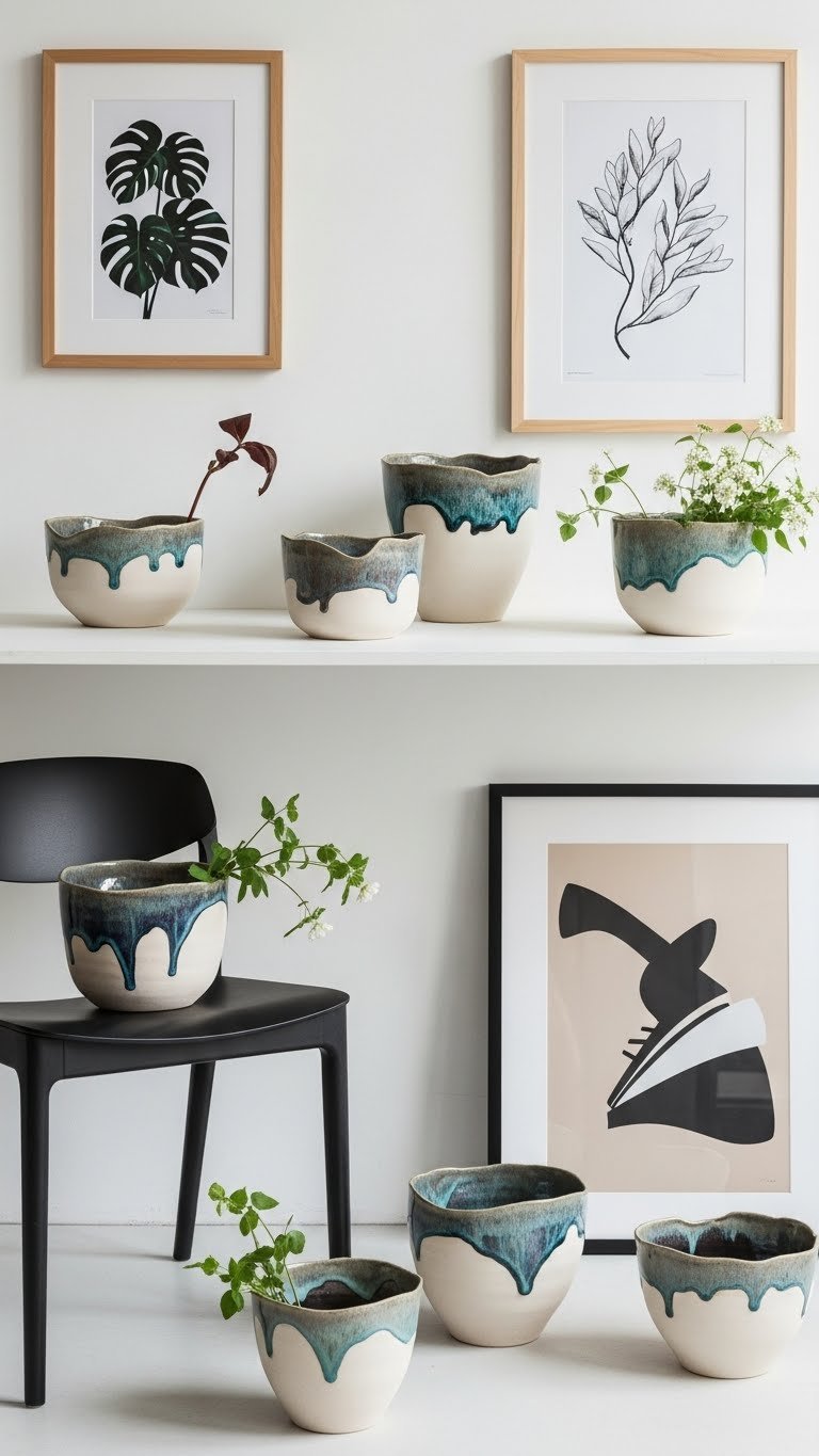 Sculptural ceramics bring a soft, tactile counterpoint to angular furniture and framed prints, so choose pieces with irregular rims, gentle curves, and imperfect glazes that echo the plant corner’s movement.