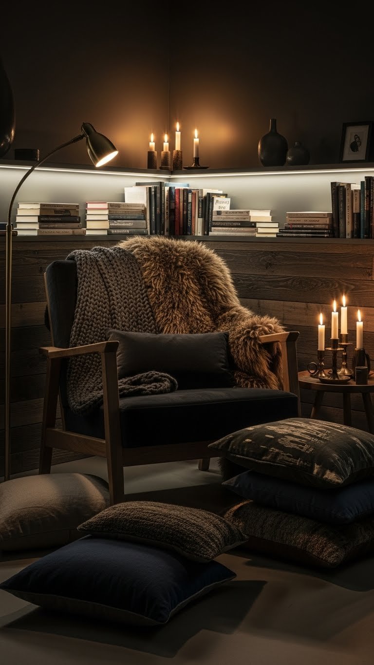 You’ll craft a moody alcove with low shelves, a sculptural chair, tactile cushions, and candlelight reading for atmosphere.