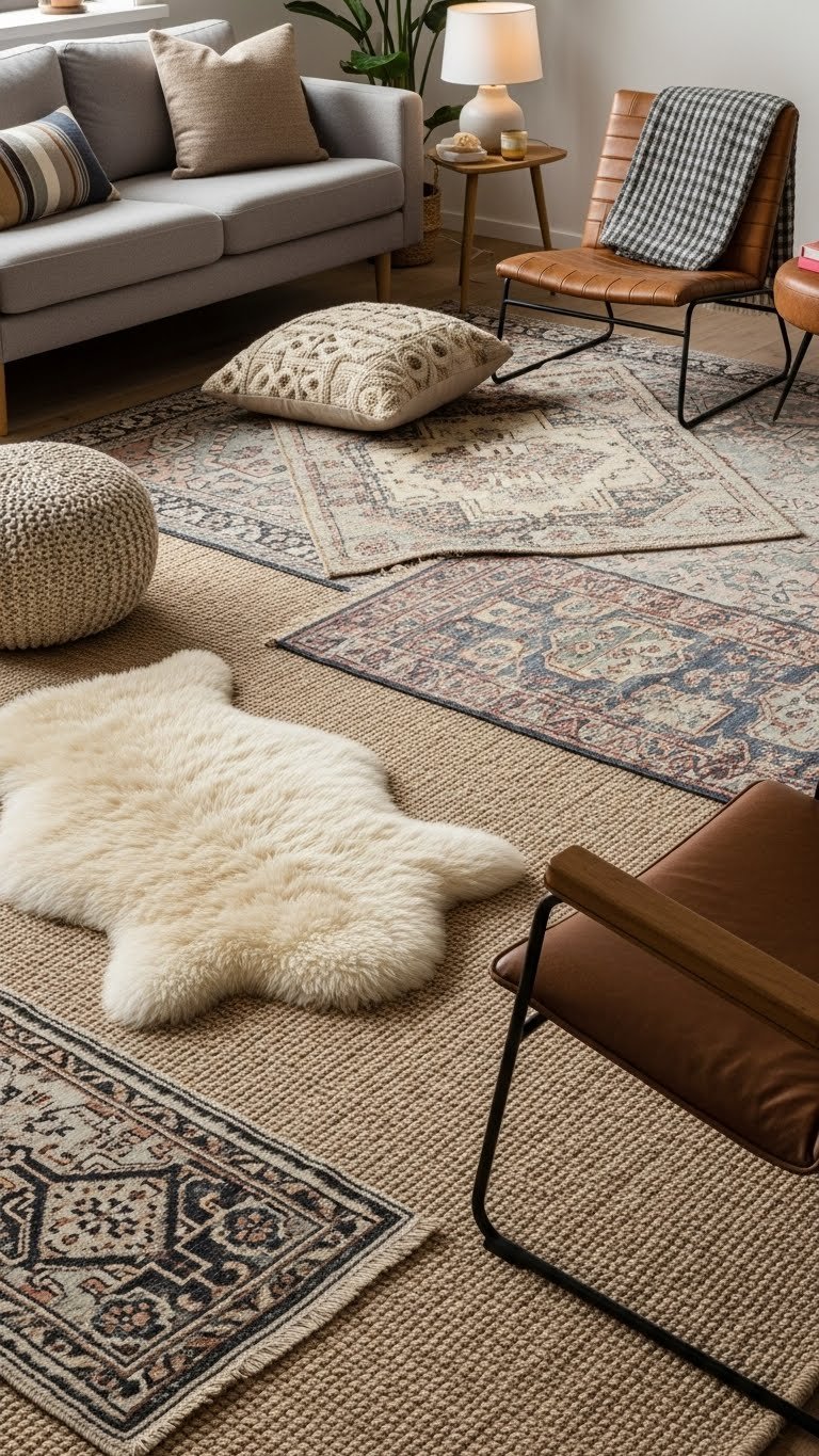 To carry that grandmillennial mix into the floor, stack rugs to add depth, warmth, and a curated sense of collectedness. You’ll combine textured layered jute with patterned vintage pieces, then soften edges with a plush sheepskin for contrast.