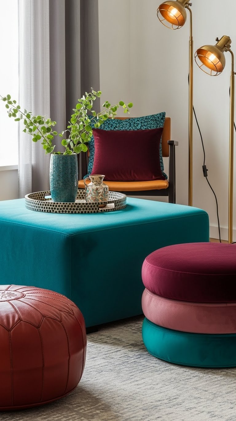 Choose a teal ottoman as anchor, add a burgundy pouf for contrast, layer a velvet pouf for texture, and finish with vintage brass lighting or tray.