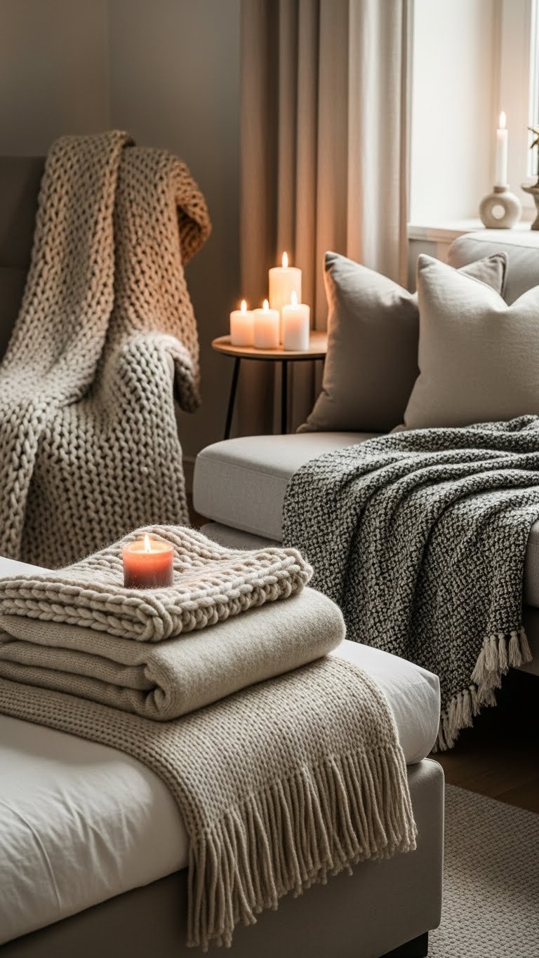 Choose chunky knits, neutral hues, and tactile cushions; mix candle lit textures for warmth. You’ll craft a free, cozy sanctuary that feels intentional.