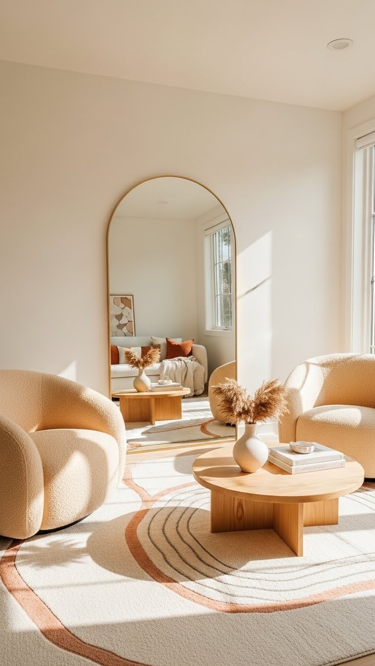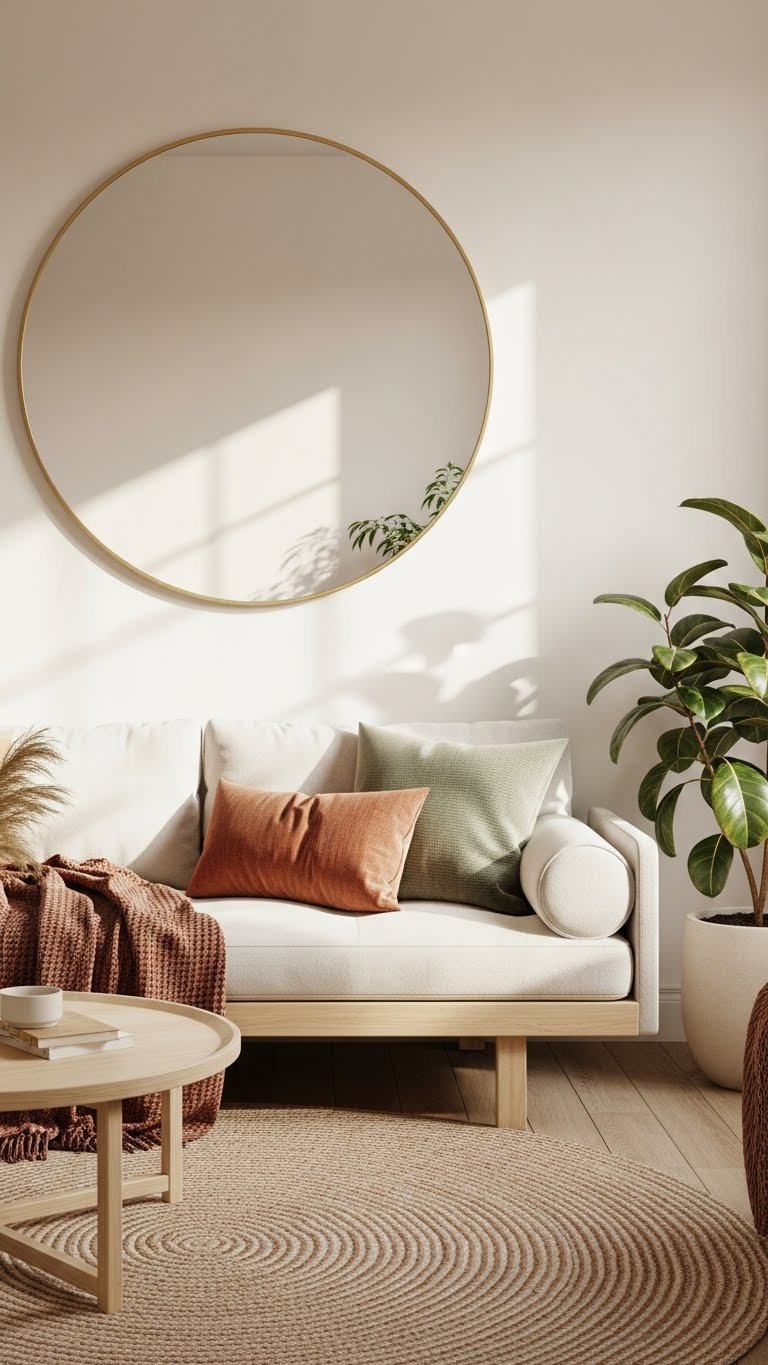 Why not soften hard lines with a round mirror and a circular rug to make your room feel more welcoming? Place a round mirror to reflect light and expand space, and anchor seating with a circular rug to create an intimate flow.